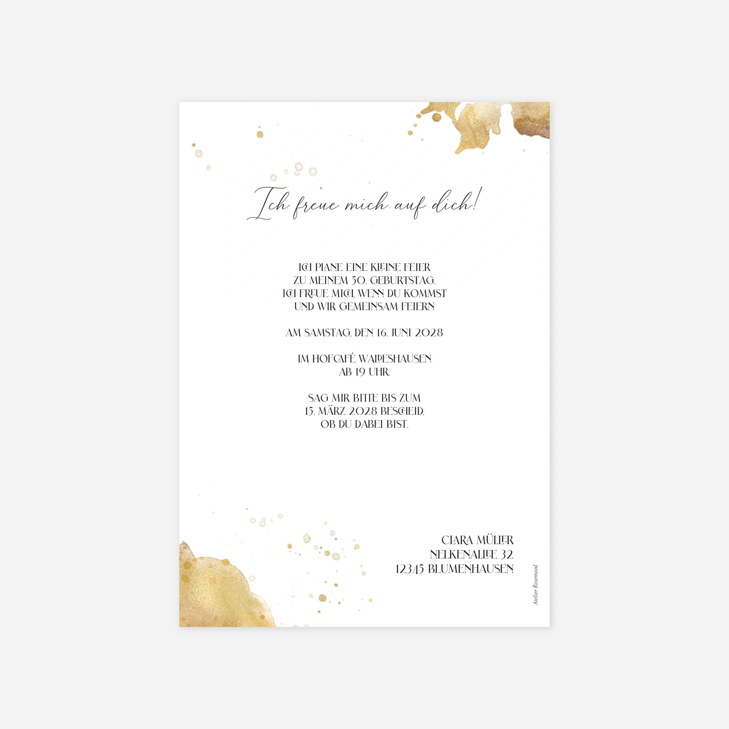 Feiern Sie Ihren Ehrentag mit der Einladung Geburtstag "Goldenes Prickeln", die durch ihr künstlerisches Design und eine Prise Humor sofort für festliche Stimmung sorgt. Die elegante Illustration eines Sektglases, untermalt von goldenen Aquarellakzenten, lädt Ihre Gäste auf stilvolle Weise dazu ein, gemeinsam mit Ihnen auf das Leben anzustoßen. Jede Karte wird in unseren eigenen Ateliers mit Liebe zum Detail entworfen, um Ihren besonderen Moment perfekt einzuleiten. Wir drucken Ihre persönlichen Einladungen mit höchster Präzision in unseren hauseigenen Produktionsstätten in Deutschland und Frankreich. Gestalten Sie Ihr individuelles Set jetzt online und lassen Sie die Vorfreude auf Ihre Feier sprudeln.