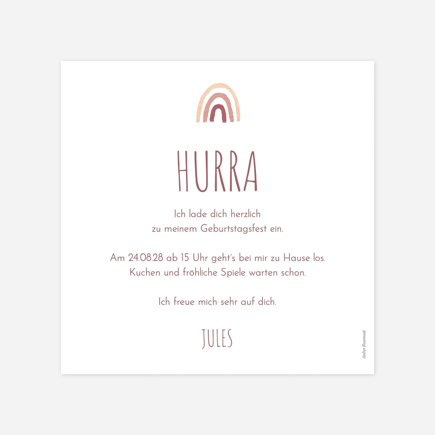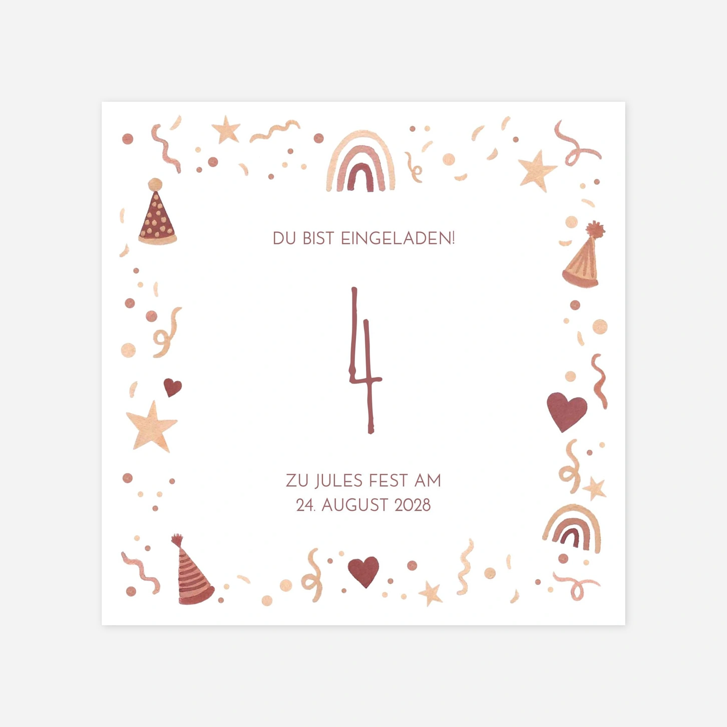 Die Einladungskarte Kindergeburtstag "Kleines Fest" verzaubert durch ihre verspielten Illustrationen von Regenbögen und Konfetti, die sofort Vorfreude auf den großen Tag wecken. Gestalten Sie diese Einladung ganz individuell mit dem schönsten Foto Ihres Kindes und persönlichen Worten für Ihre Gäste. Da uns Qualität am Herzen liegt, wird dieses Design in unseren eigenen Ateliers mit höchster Präzision auf Premium-Papier gedruckt. Entdecken Sie die Freude am Gestalten und lassen Sie Ihre Einladung zum Kindergeburtstag bei uns professionell drucken. Gestalten Sie Ihr Set jetzt online.