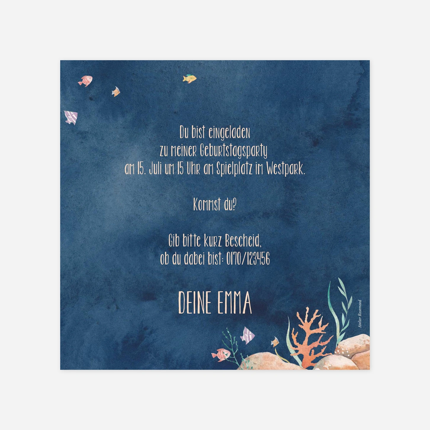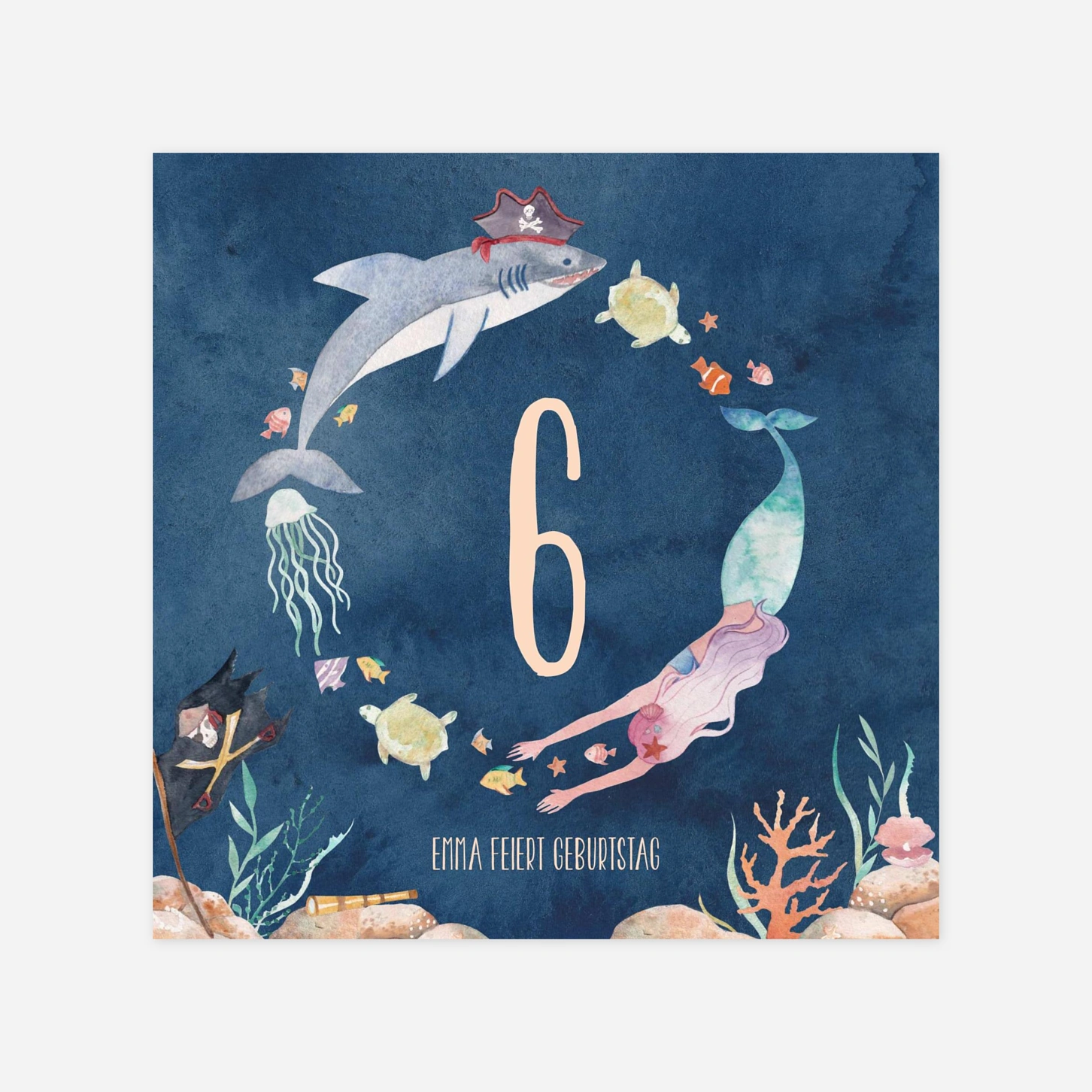 Die Einladung zum Kindergeburtstag "Meeresfreunde" entführt kleine Entdecker in eine zauberhafte Unterwasserwelt voller Piraten-Abenteuer und Meerjungfrauen-Magie. Mit ihren liebevollen Illustrationen von Haien, Schildkröten und Korallen ist diese Karte die ideale Wahl, um Freunde und Familie stilvoll zu Ihrem Fest einzuladen. Gestalten Sie Ihre Einladungskarte ganz einfach online und verleihen Sie der Ankündigung mit Ihrem individuellen Text eine persönliche Note. Unsere Designs werden mit größter Sorgfalt in unseren eigenen Ateliers für Sie entworfen und auf hochwertigem Papier gedruckt. Vertrauen Sie auf unsere langjährige Expertise, um diesen besonderen Tag gebührend einzuleiten.