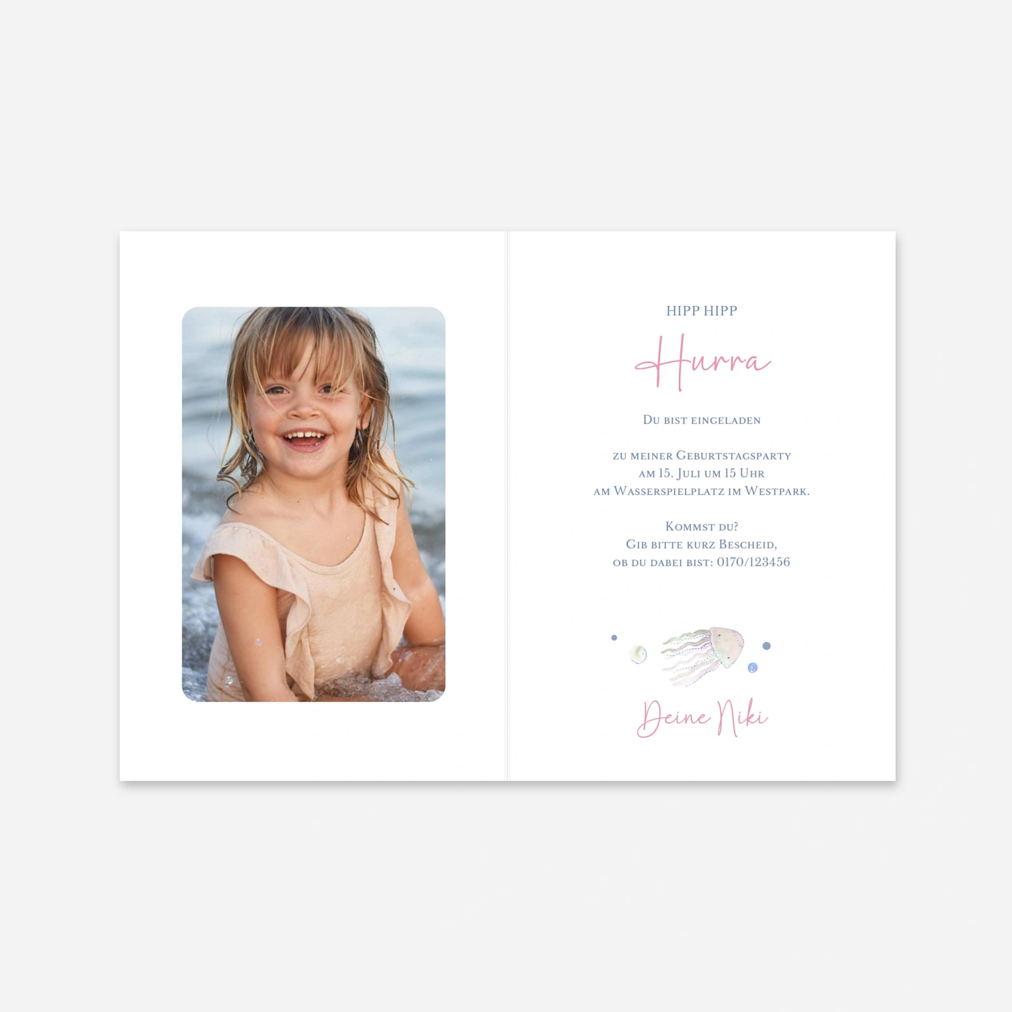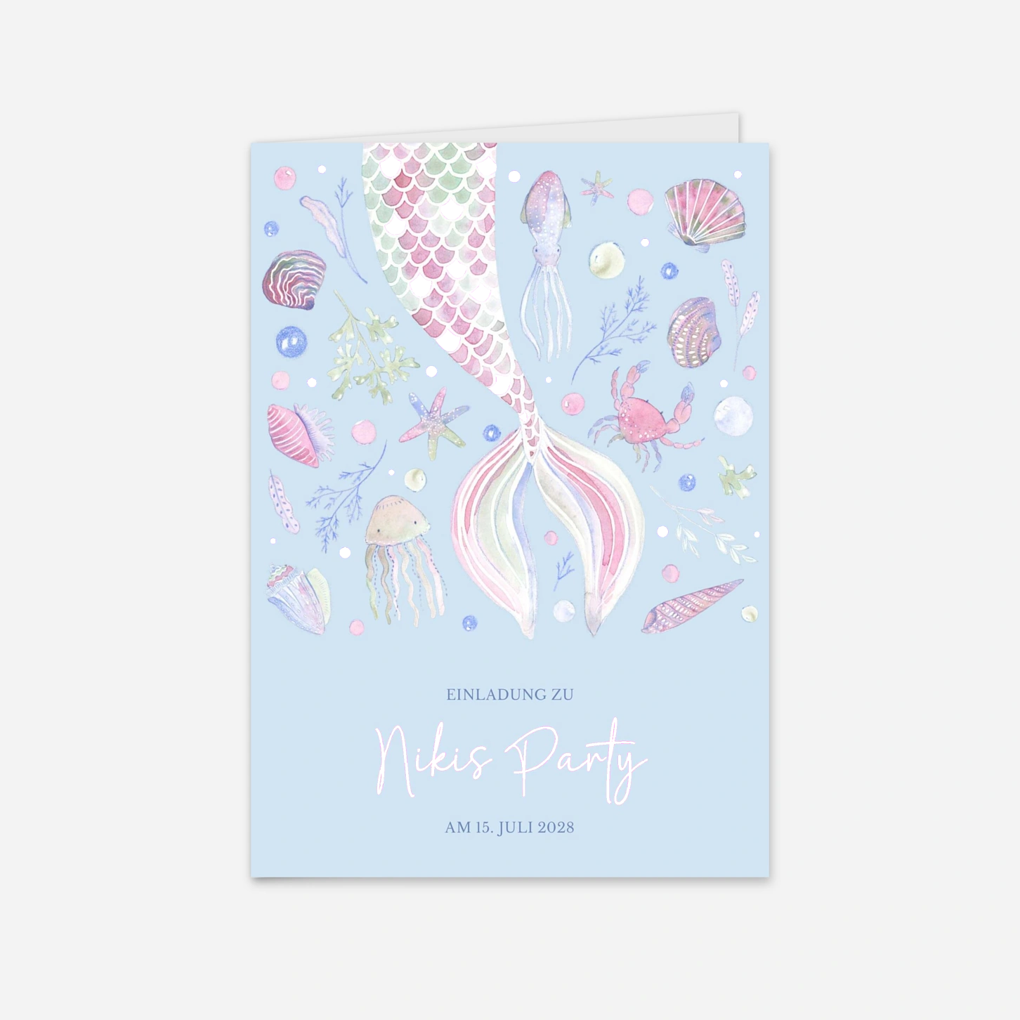 Bringen Sie einen Hauch von Magie in den Ehrentag Ihres Kindes mit der Einladung zum Kindergeburtstag "Meermärchen", die durch ihre bezaubernden Illustrationen einer kleinen Meerjungfrau und verspielten Meeresbewohnern verzückt. Das liebevoll gestaltete Design entführt die kleinen Gäste in eine glitzernde Unterwasserwelt und weckt sofort die Vorfreude auf ein märchenhaftes Fest. Wir drucken Ihre Karten mit höchster Präzision in unseren hauseigenen Ateliers in Deutschland und Frankreich, um eine exzellente Qualität auf unseren hochwertigen Papieren sicherzustellen. Vertrauen Sie auf unsere Expertise und Leidenschaft für schönes Design, wenn Sie Ihre individuelle Geburtstagseinladung gestalten. Möchten Sie direkt online loslegen und Ihre persönliche Karte mit nur wenigen Klicks erstellen?