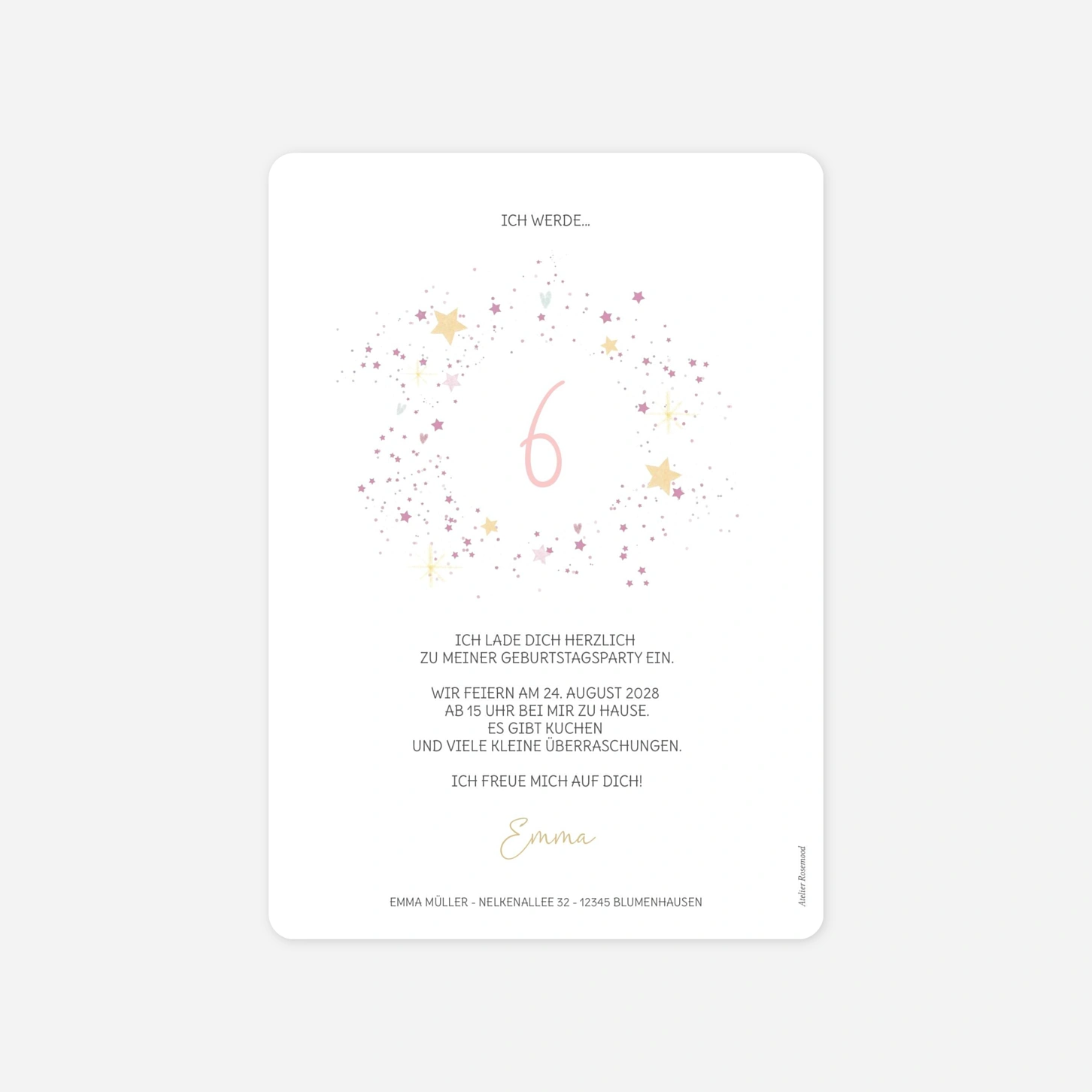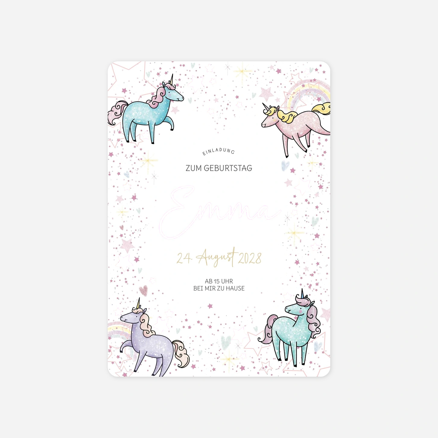 Die Geburtstagseinladung "Wolkenritt" entführt kleine Gäste in eine zauberhafte Welt voller Sternenstaub und magischer Einhörner. Das verträumte Design mit glitzernden Sternen und einem sanften Regenbogen ist die perfekte Wahl, um eine Einladung zum Kindergeburtstag zu gestalten, die zum Träumen einlädt. In unseren eigenen Produktionsstätten in Deutschland und Frankreich fertigen wir jede Karte mit höchster Präzision und Leidenschaft für schönes Papier. Vertrauen Sie auf unsere erstklassige Druckqualität und fordern Sie vorab ein kostenloses Muster an, um die Premium-Qualität unserer Materialien persönlich zu prüfen. Gestalten Sie dieses liebevolle Kartenset jetzt ganz einfach online für den nächsten Ehrentag.