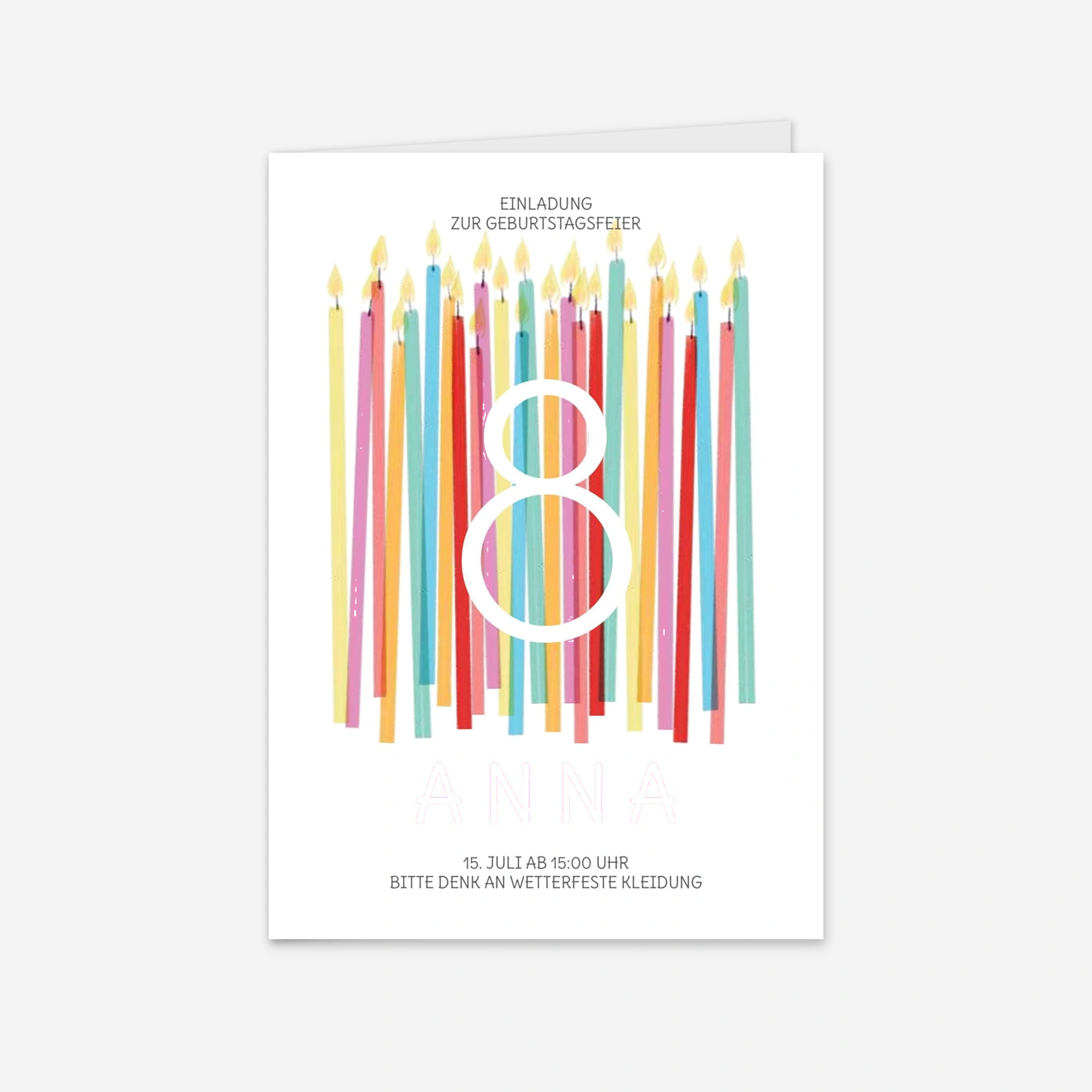 Die Geburtstagseinladung "Wunschlichter" bringt mit ihren bunten, illustrierten Kerzen strahlende Freude auf jede Postkarte. Das fröhliche Design setzt das Alter Ihres Kindes spielerisch in Szene und ist die perfekte Wahl, um Freunde zu einem unvergesslichen Kindergeburtstag einzuladen. Jede Karte wird mit Liebe zum Detail in unseren hauseigenen Produktionsstätten in Deutschland und Frankreich für Sie gefertigt. Vertrauen Sie auf unsere Premium-Papiere und den präzisen Druck, wenn Sie Ihre individuelle Einladung zum Kindergeburtstag gestalten. Bestellen Sie vorab ein kostenloses Muster, um sich von der besonderen Qualität unserer Materialien persönlich zu überzeugen.