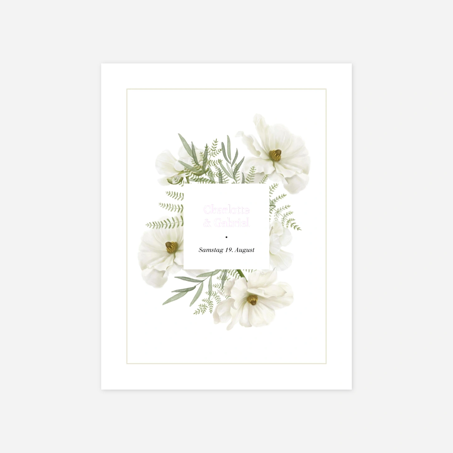 Die Hochzeitseinladung "Blumig" vereint elegante Schlichtheit mit natürlicher Schönheit. Zarte Blüten und feine Farnblätter umrahmen die moderne Typografie und schaffen eine harmonische Komposition, die zeitlosen Charme und Romantik ausstrahlt.