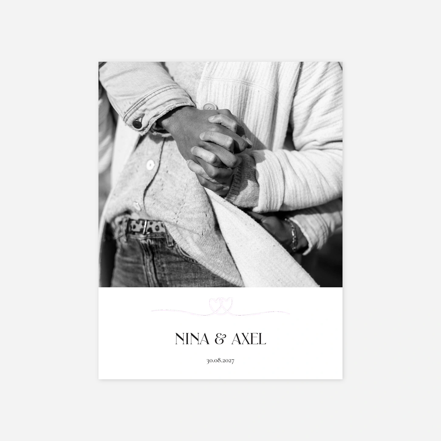 Die Hochzeitseinladung Bündnis ist ideal, um Ihren großen Tag mit Eleganz und Stil zu teilen – die zwei ineinander verschlungene Herzen in diesem schlichten, aber liebevollen Design symbolisieren die tiefe Verbundenheit des Brautpaares.