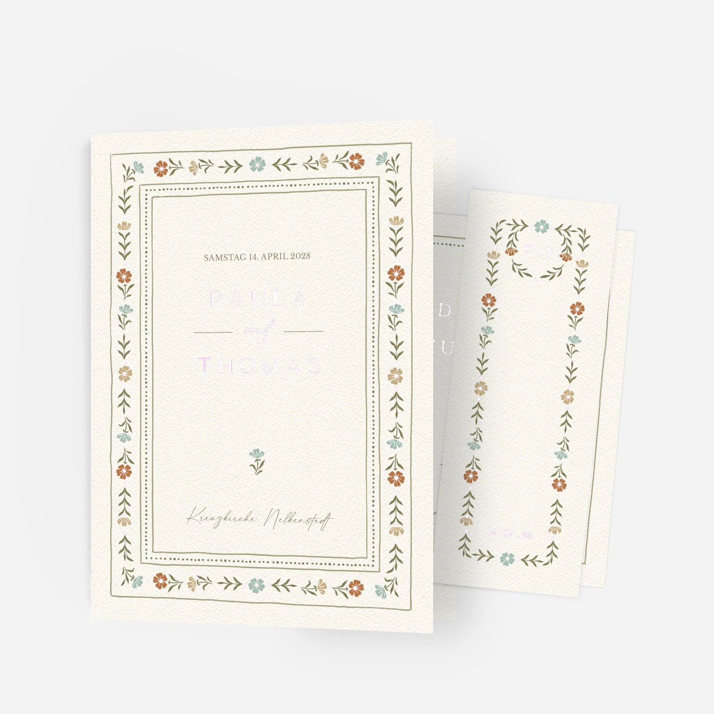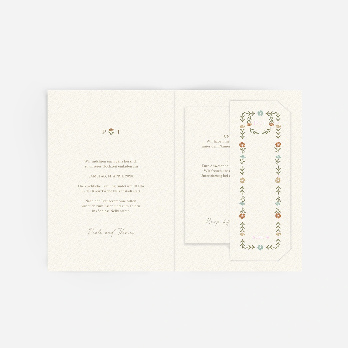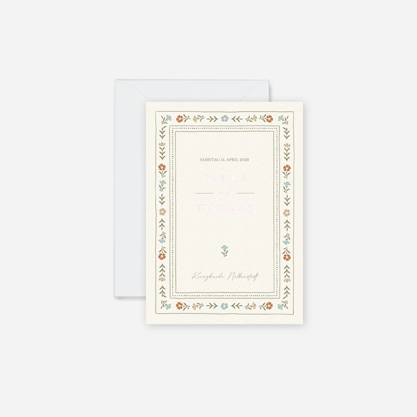 Mit „Im Grünen“ laden Sie Ihre Gäste zu einer Feier ein, die von schlichter Schönheit und liebevollen Details lebt. Eine feine Bordüre aus zarten floralen Illustrationen umrahmt den Text und erinnert an einen blühenden Garten. Filigrane Linien und Ornamente verbinden klassische Eleganz mit einem zeitlosen Charme. Senden Sie einen liebevollen ersten Gruß, der Ihre Gäste auf einen unvergesslichen Tag einstimmt.