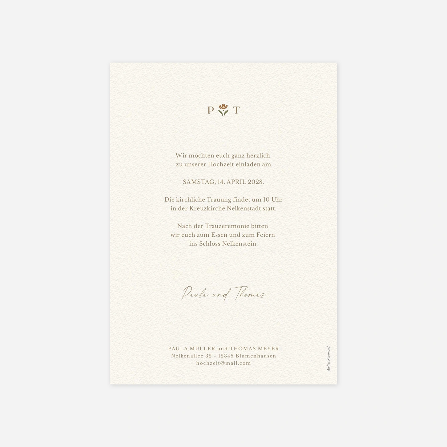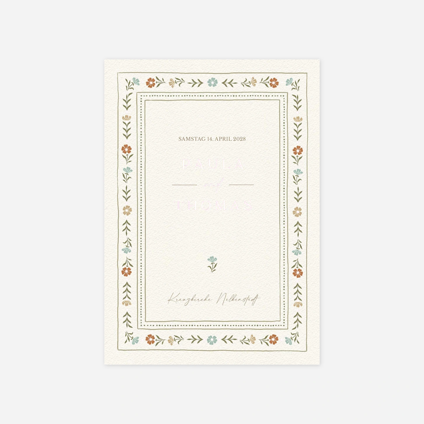 Mit „Im Grünen“ laden Sie Ihre Gäste zu einer Feier ein, die von schlichter Schönheit und liebevollen Details lebt. Eine feine Bordüre aus zarten floralen Illustrationen umrahmt den Text und erinnert an einen blühenden Garten. Filigrane Linien und Ornamente verbinden klassische Eleganz mit einem zeitlosen Charme. Senden Sie einen liebevollen ersten Gruß, der Ihre Gäste auf einen unvergesslichen Tag einstimmt.