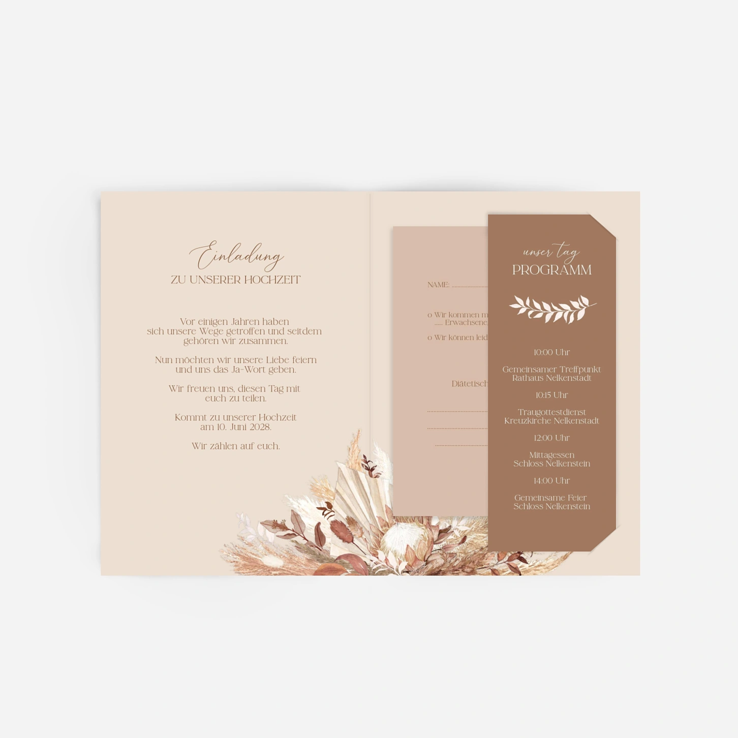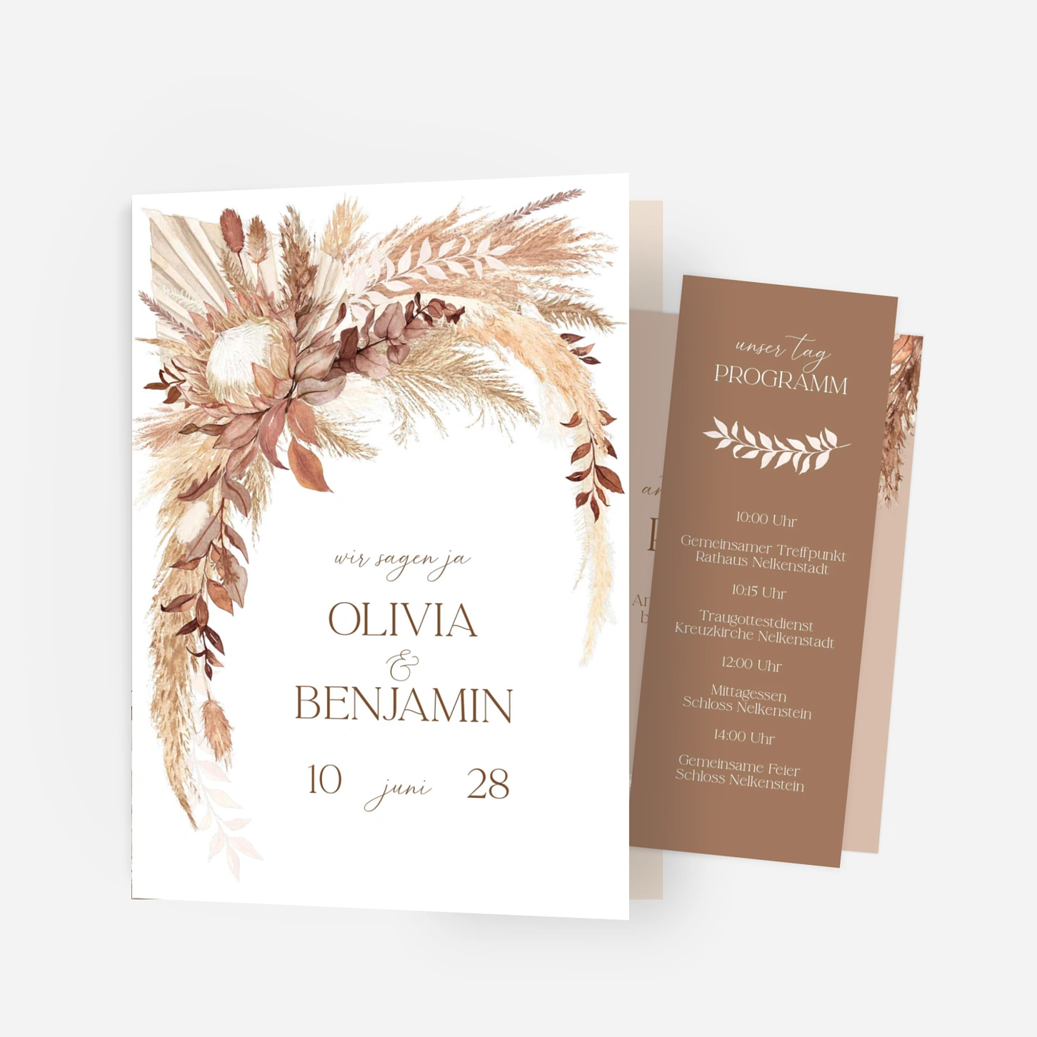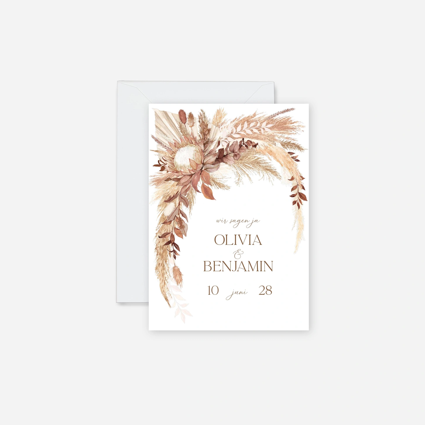 Die Hochzeitseinladung „Sanftes Bouquet“ vereint eine natürliche Leichtigkeit mit eleganter Zurückhaltung und stimmt Ihre Gäste gefühlvoll auf den großen Tag ein. Zarte florale Illustrationen und eine ausgewogene Typografie machen diese Hochzeitseinladung zur idealen Wahl, wenn Sie Ihre Einladung zur Hochzeit drucken lassen und dabei auf zeitlose Ästhetik setzen möchten. Gestalten Sie Ihre Hochzeitseinladung online ganz nach Ihren Wünschen – auf Wunsch bestellen Sie vorab ein kostenloses Musterexemplar. Wie alle unsere Designs wurde auch dieses Motiv in unserem Atelier entworfen und in unseren eigenen Produktionsstätten in Deutschland und Frankreich gefertigt.