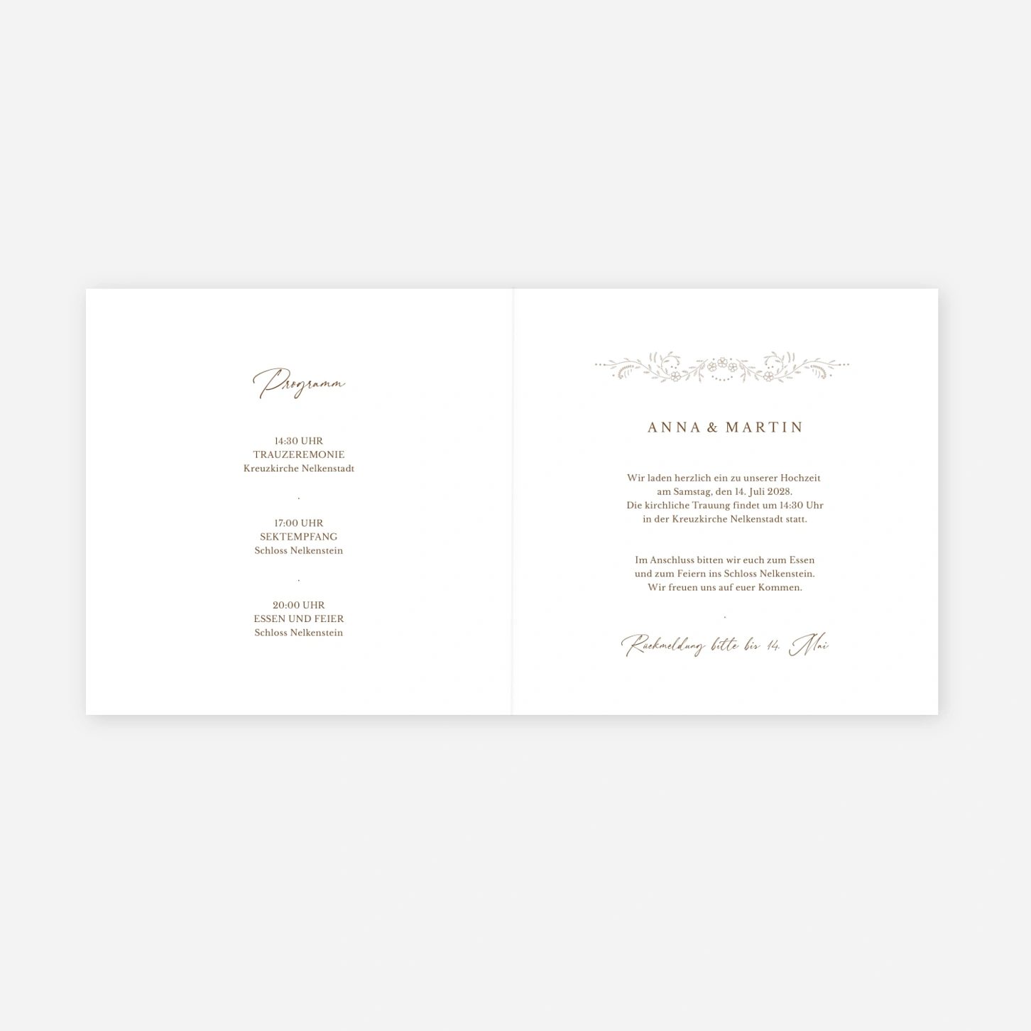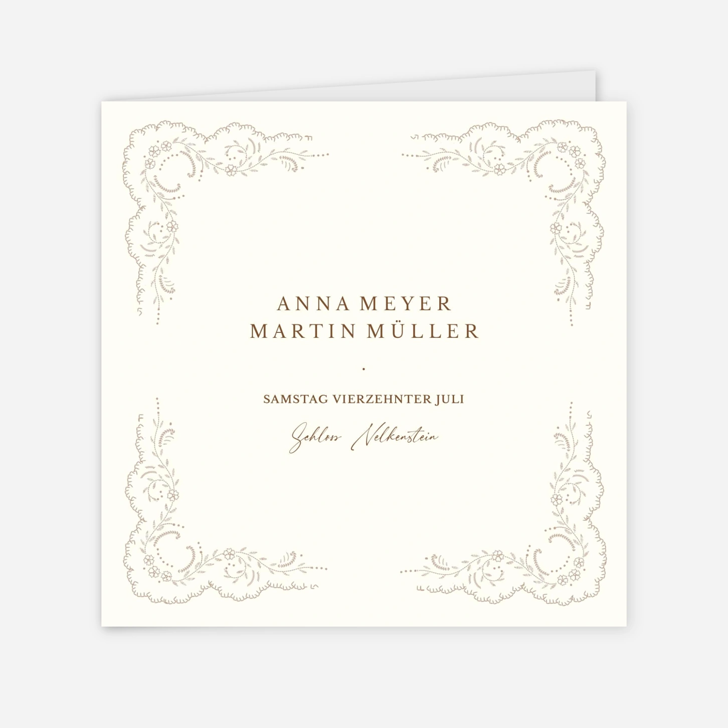 Mit zarten Ornamenten, die an kunstvolle Stickereien erinnern, rahmt die Hochzeitseinladung „Verwebt“ Ihre Namen und das Datum Ihres großen Tages in eleganter Harmonie ein. Die filigranen Verzierungen verleihen der Karte einen Hauch nostalgischer Romantik, während das klare Layout und die sorgfältig abgestimmte Typografie für eine moderne Note sorgen. Gedruckt auf hochwertigem Papier mit präziser Detailtreue entsteht eine Einladung, die Ihre Gäste schon beim ersten Blick verzaubert. So kündigt sie Ihr Fest auf stilvolle Weise an und gibt einen Vorgeschmack auf die besondere Atmosphäre Ihres Hochzeitstags.