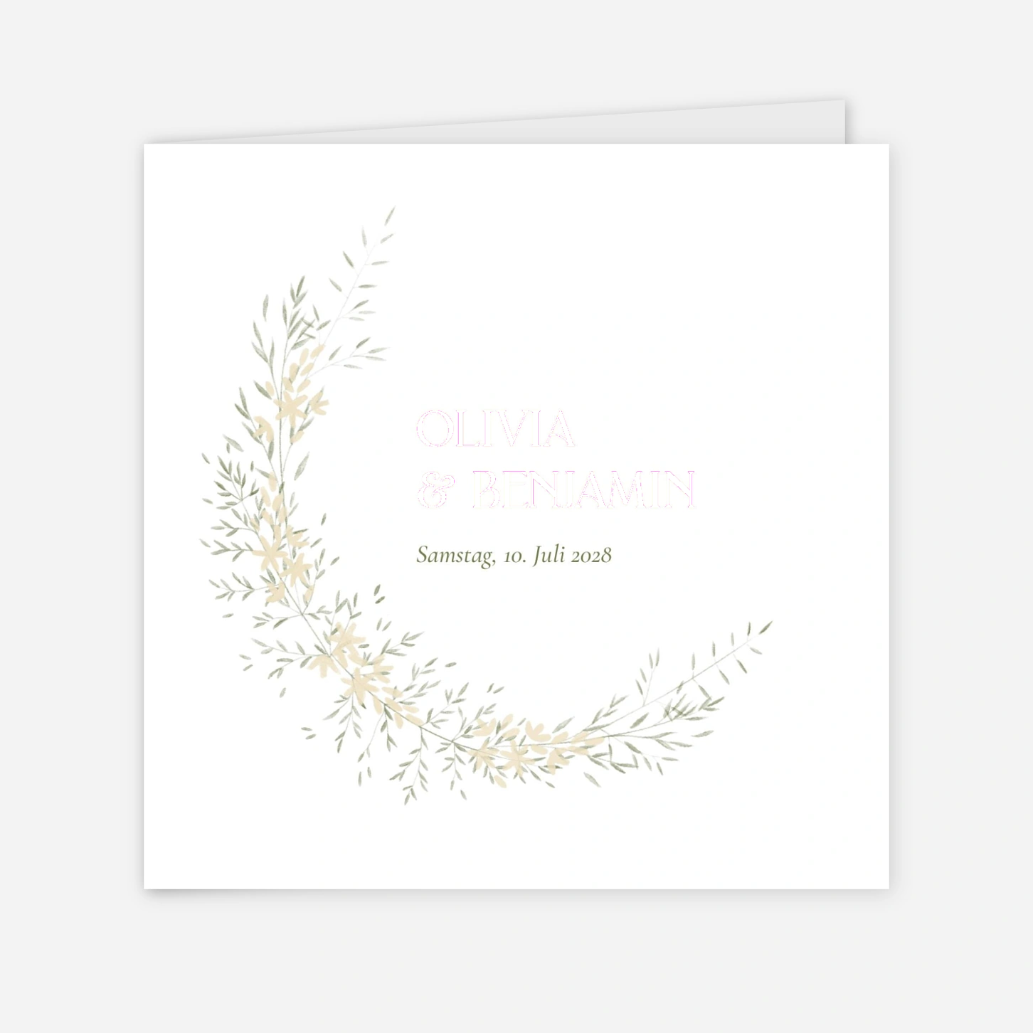 Die Hochzeitseinladung Zarte Blüten bezaubert mit einem eleganten Blütenkranz, der feine florale Elemente kunstvoll in Szene setzt. Die schlichte Typografie fügt sich harmonisch in das Design ein und verleiht der Karte eine romantische Leichtigkeit.