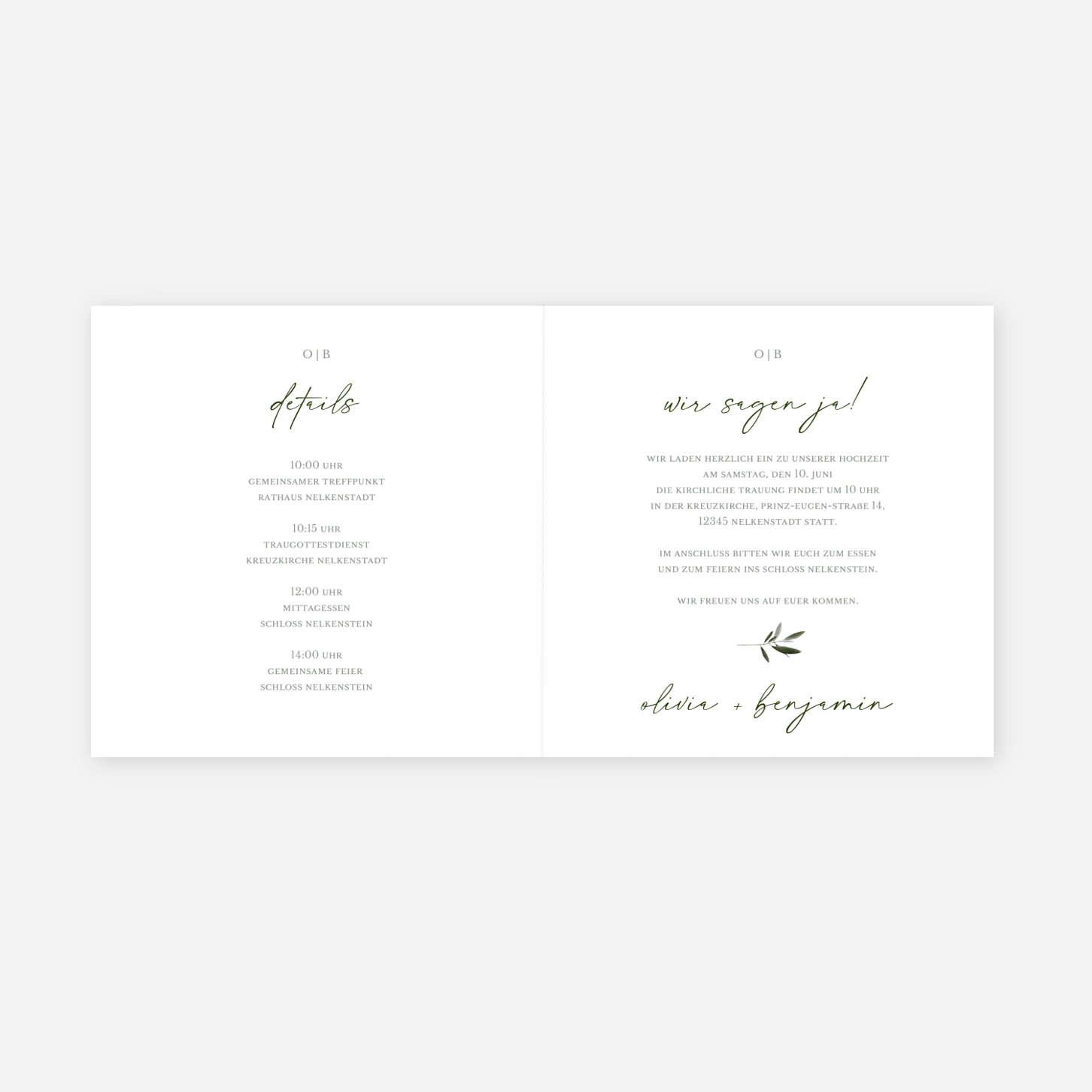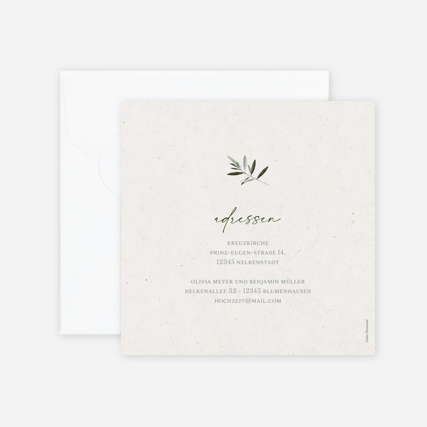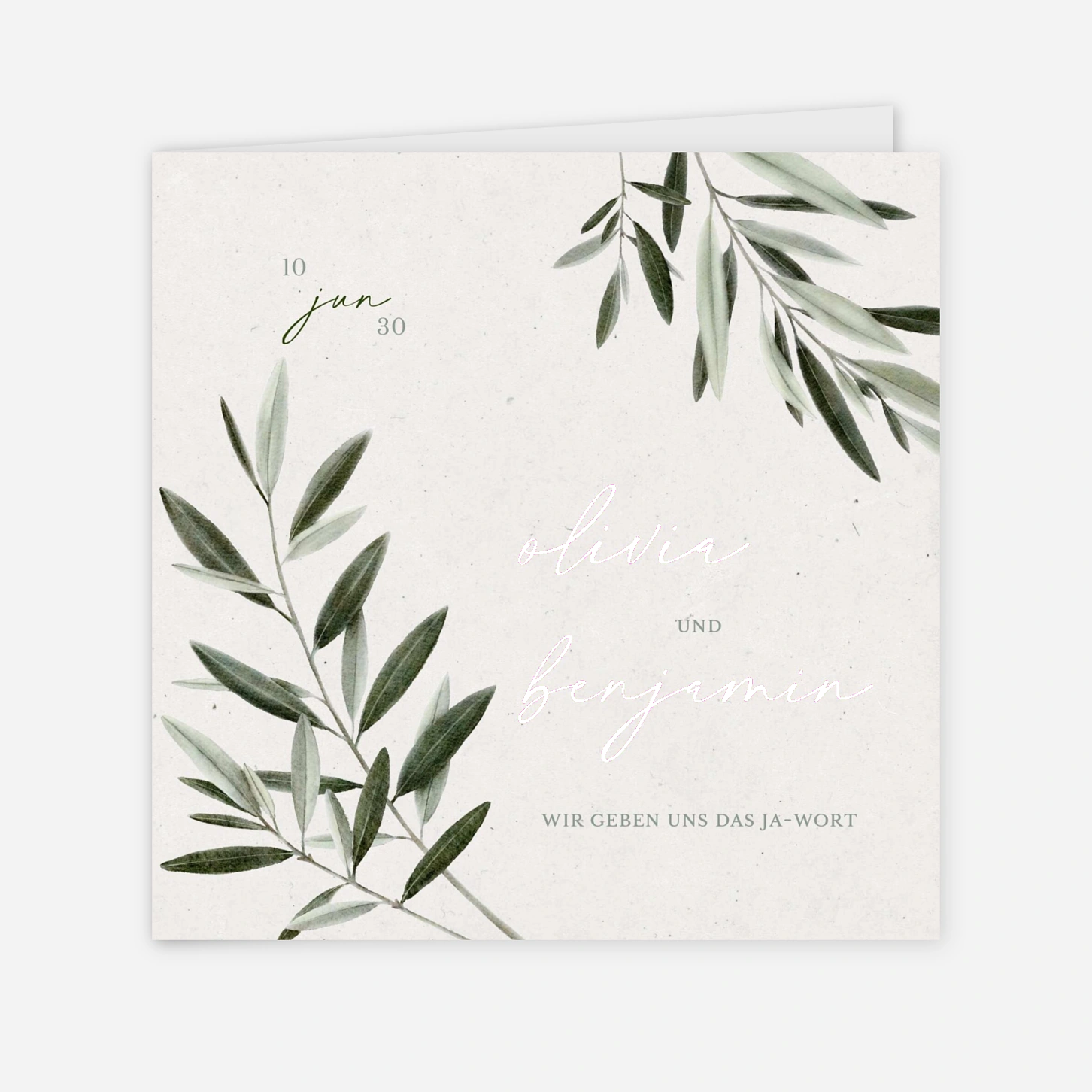 Die Hochzeitseinladung „Zarter Olivenduft“ bringt eine sanfte, natürliche Eleganz in Ihren großen Tag und setzt Ihre Namen mit liebevoller Leichtigkeit in Szene. Die zarten Zweige schaffen eine ruhige, moderne Atmosphäre, die perfekt zu einer feierlichen und zugleich entspannten Hochzeit passt. Gedruckt wird Ihre Einladung in unseren eigenen Ateliers in Deutschland und Frankreich – mit viel Sorgfalt und einem Blick fürs Detail. Nutzen Sie die Möglichkeit, Ihre Einladung zur Hochzeit ganz persönlich zu gestalten und online drucken zu lassen.