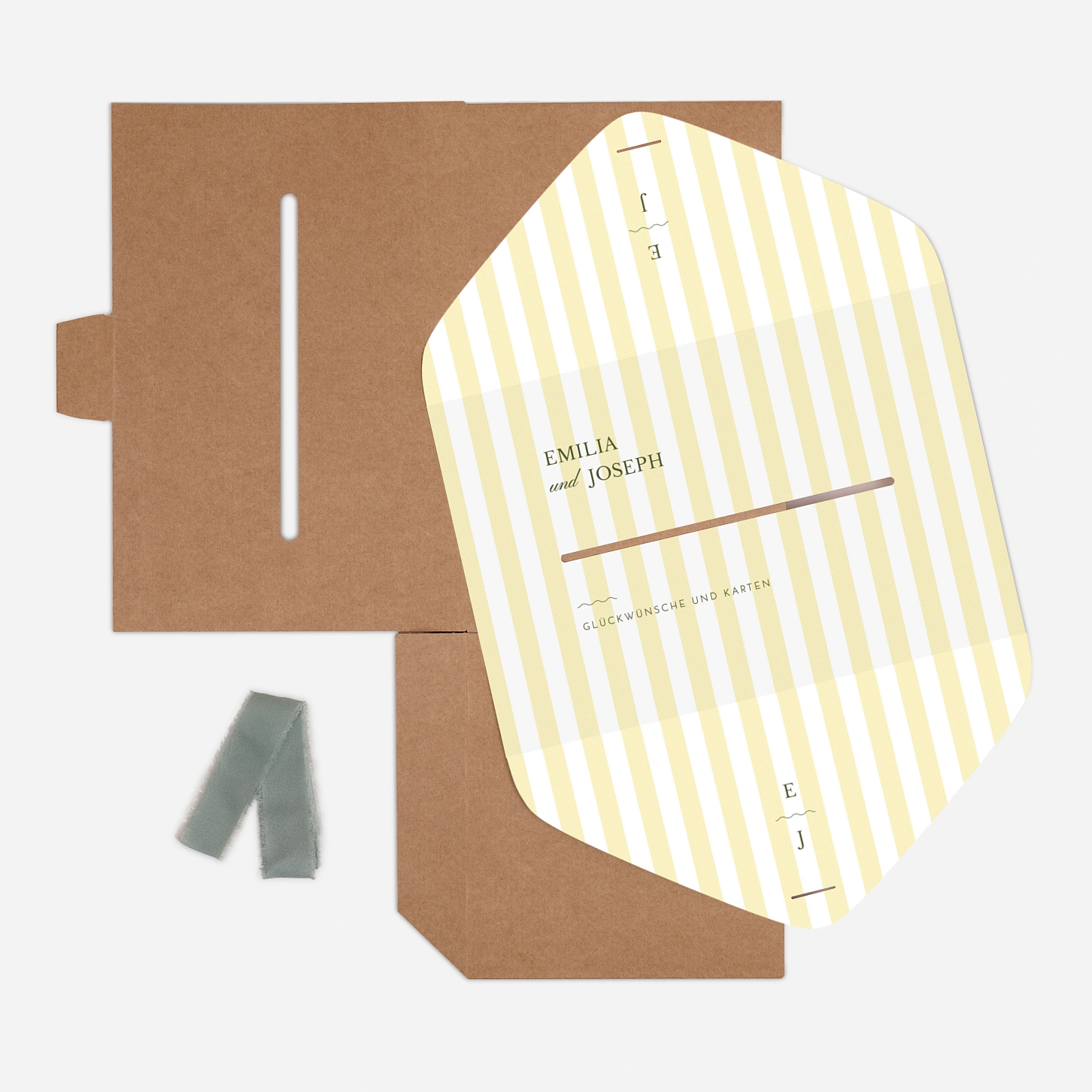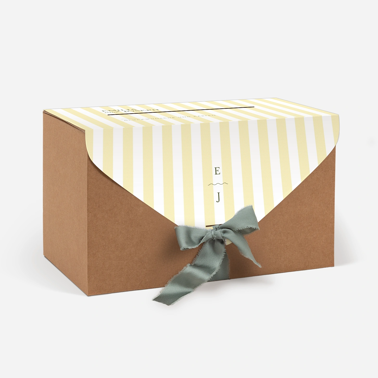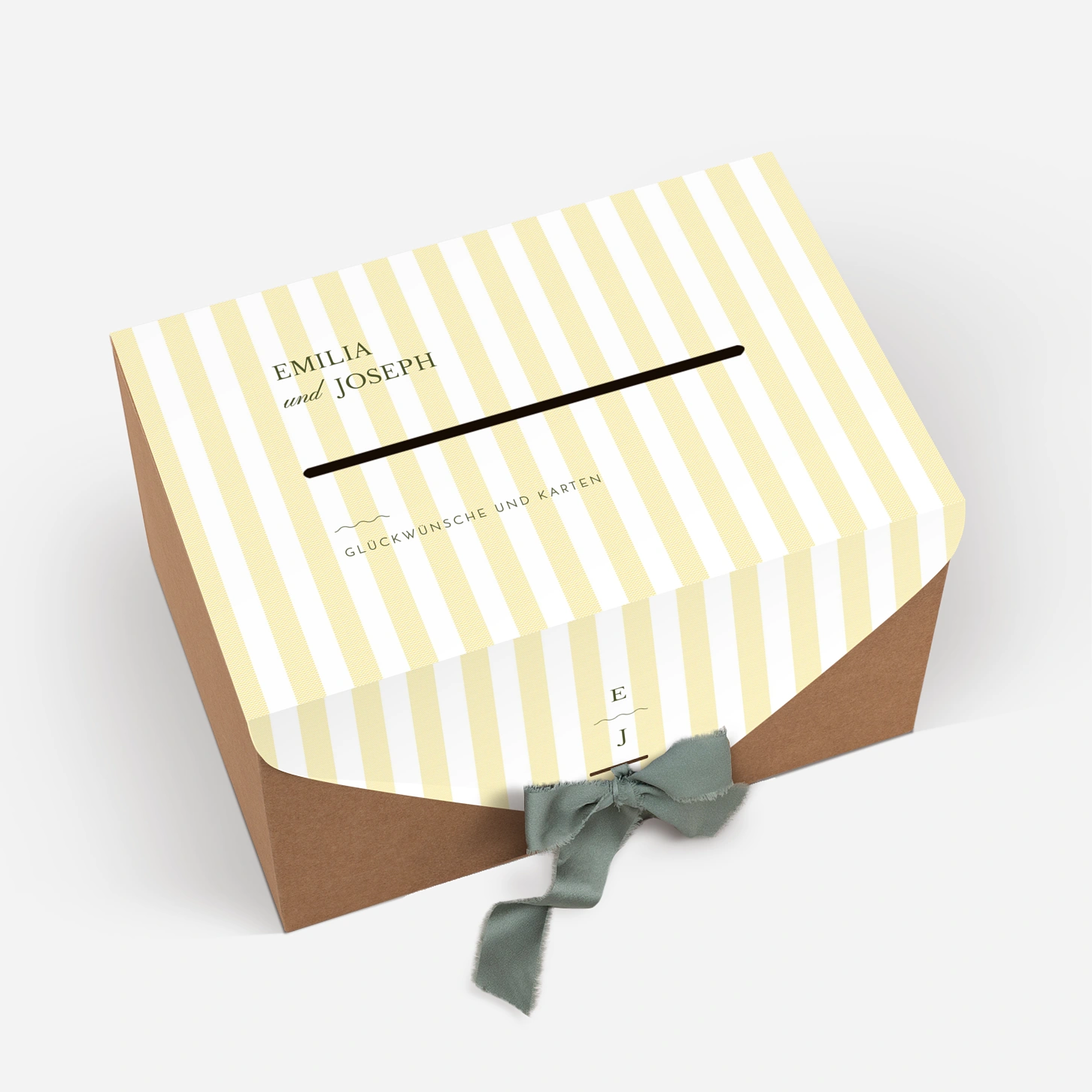 Die Kartenbox "Dolce Amore" ist die ideale Lösung, um Glückwünsche und kleine Aufmerksamkeiten Ihrer Gäste stilvoll zu sammeln. Sie ist mit elegantem Karton in feinen hellblauen oder gelben Streifen versehen und wird mit einem passenden Band geliefert. Im Handumdrehen zusammengebaut, fügt sie sich harmonisch in Ihre restliche Hochzeitspapeterie ein und setzt zugleich einen praktischen wie auch dekorativen Akzent – angelehnt an das italienische Flair einer Sommerhochzeit.