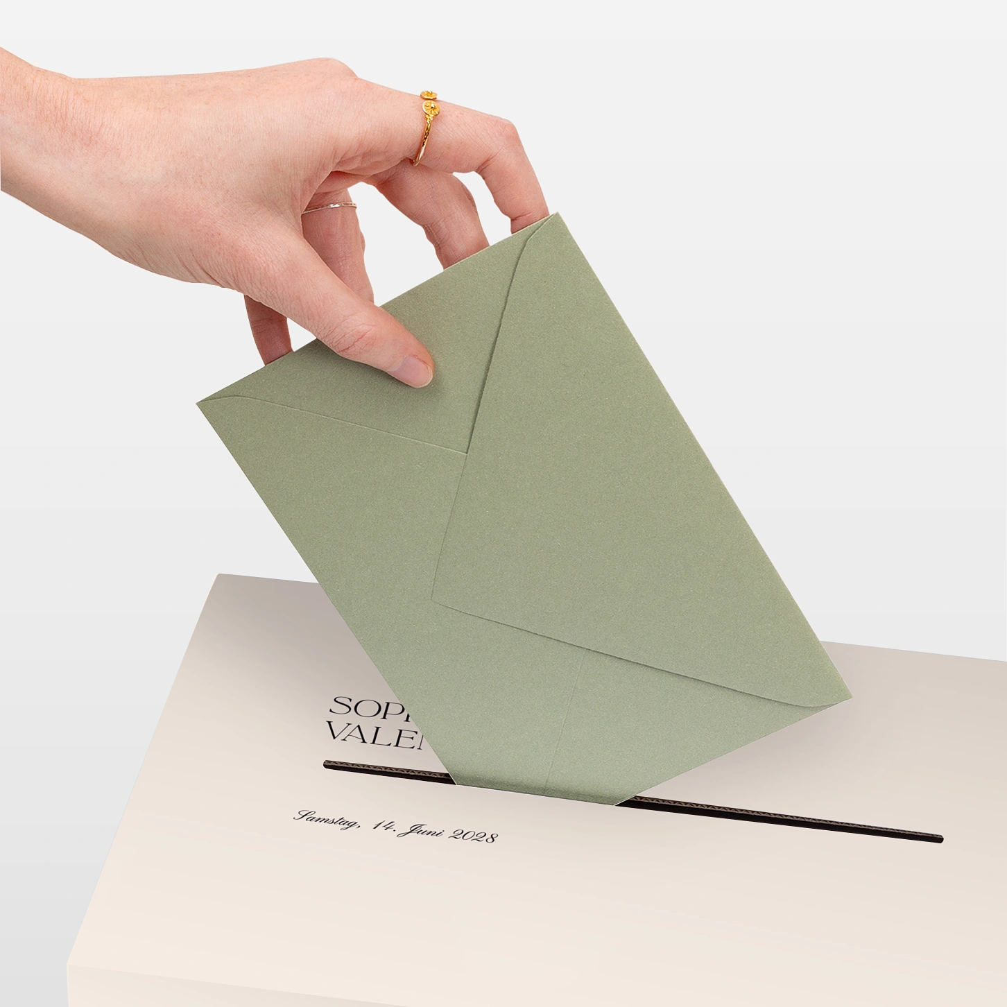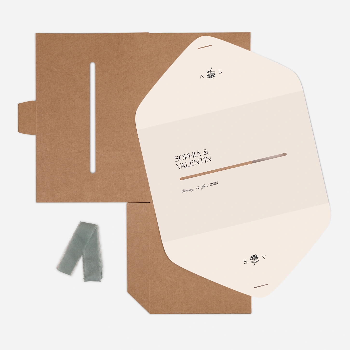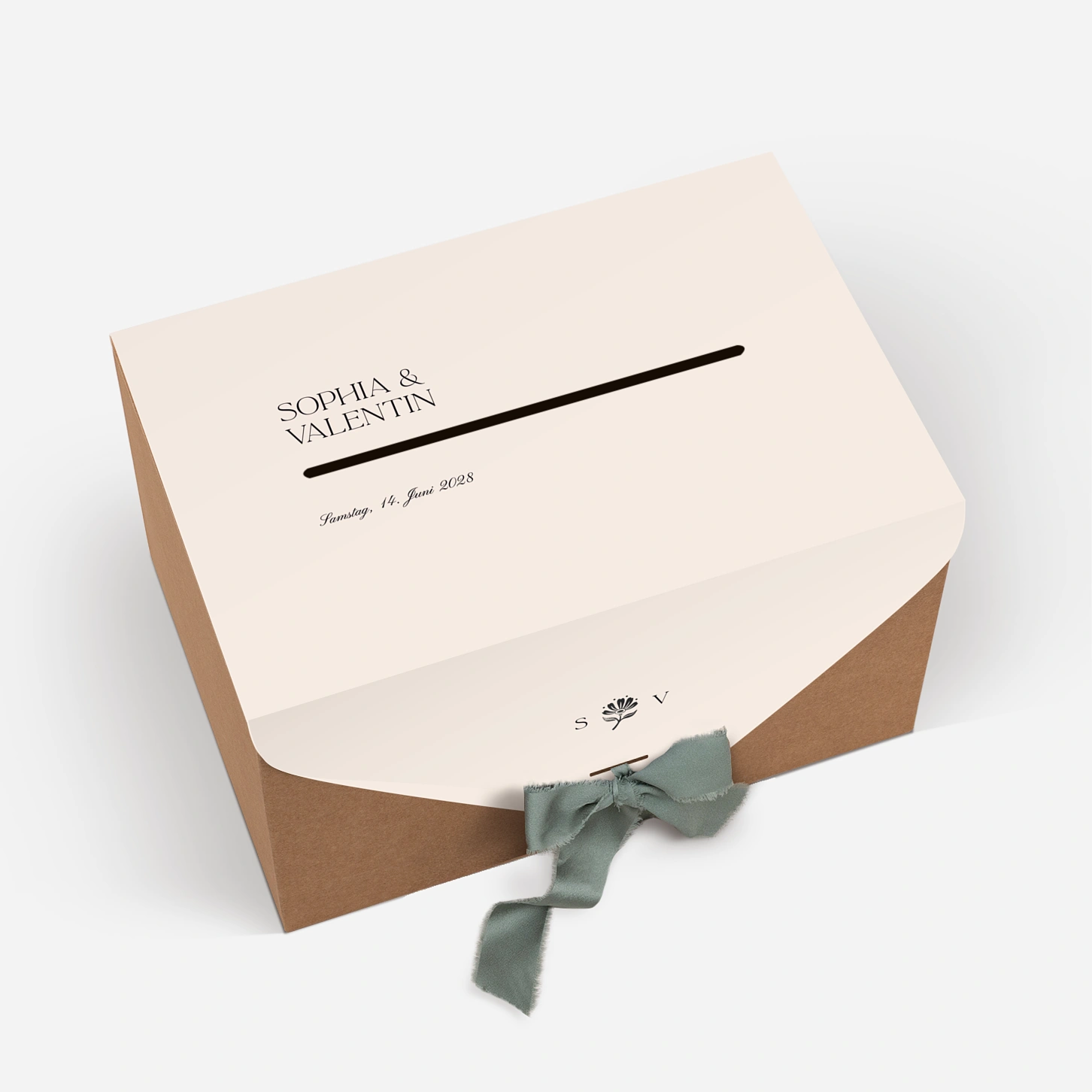 Die Kartenbox "Fleur minimale" ist die ideale Lösung, um Glückwünsche und kleine Aufmerksamkeiten Ihrer Gäste stilvoll zu sammeln. Sie wird mit einem schlichten Karton sowie einem farbigen Band geliefert und lässt sich im Handumdrehen zusammenbauen. Harmonisch abgestimmt auf Ihre übrige Hochzeitspapeterie, fügt sich die Box dezent ins Gesamtbild ein und setzt zugleich einen liebevollen dekorativen Akzent – ganz im Stil Ihrer Feier.