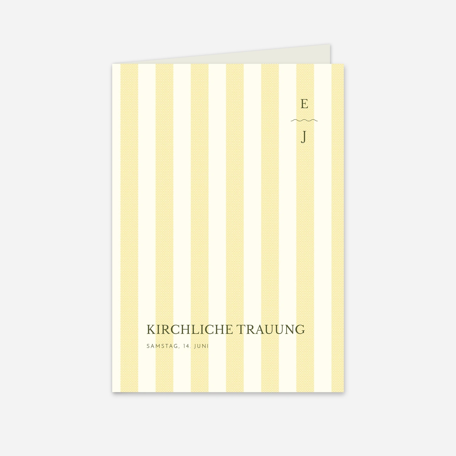 Das Kirchenheft "Dolce Amore" besticht durch seine schlichte Eleganz mit feinen hellblauen oder gelben Streifen und passt perfekt zu klassischen wie auch freien Trauungen. Im Online-Editor können Sie die Vorlage ganz nach Ihren Wünschen individuell anpassen. Auf der Rückseite findet ein Dankeswort, ein Bibelpsalm oder ein passendes Zitat Platz. Das gefaltete Kirchenheft dient als praktische Hülle für Liedtexte und den Ablauf der Zeremonie. Vorgestanzt geliefert, lässt es sich leicht falten und wird so zum stilvollen Begleiter Ihrer Trauung.