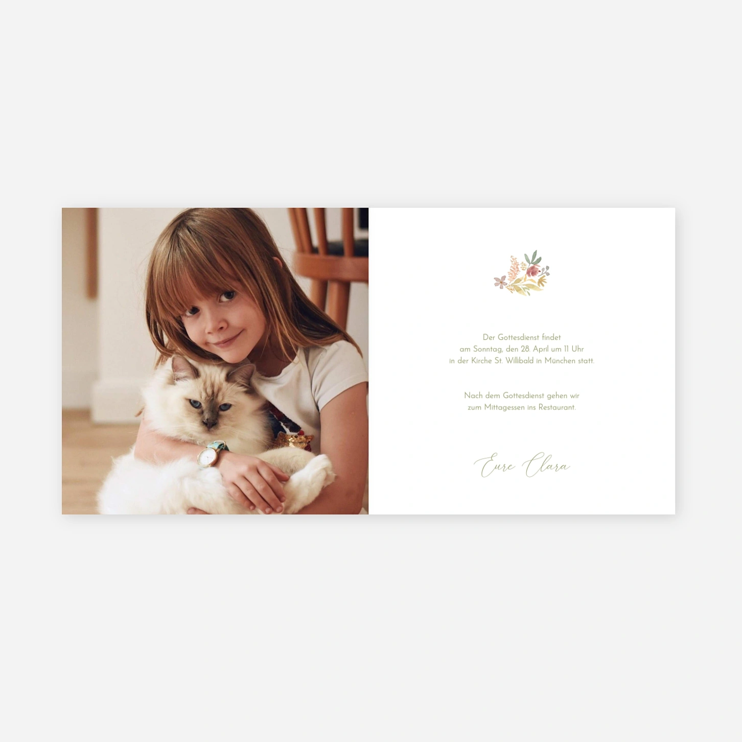 Die Einladung zur Kommunion "Blütensegen" besticht durch ihre harmonische Verbindung aus einem persönlichen Foto und einer kunstvollen Illustration. Das filigrane Blumenkreuz im Aquarellstil verleiht der Karte eine zarte, spirituelle Note, die perfekt zu diesem besonderen Meilenstein im Leben Ihres Kindes passt. In unseren hauseigenen Ateliers legen wir größten Wert auf höchste Druckqualität, damit Ihre Einladungskarten zur Kommunion genau so strahlen wie dieser Festtag selbst. Lassen Sie sich von unseren liebevollen Designs begeistern und gestalten Sie Ihr individuelles Kartenset ganz einfach online in unserem Editor.