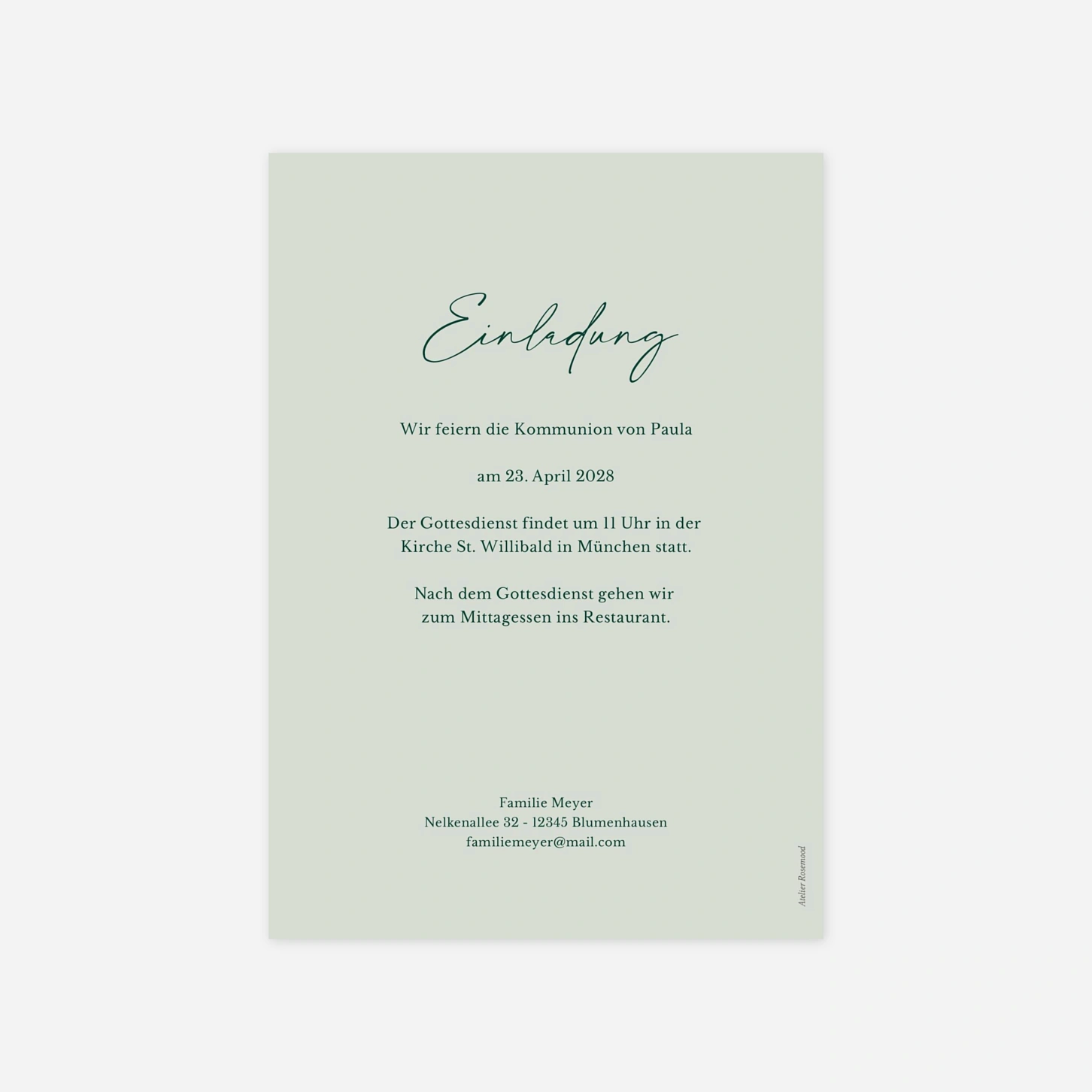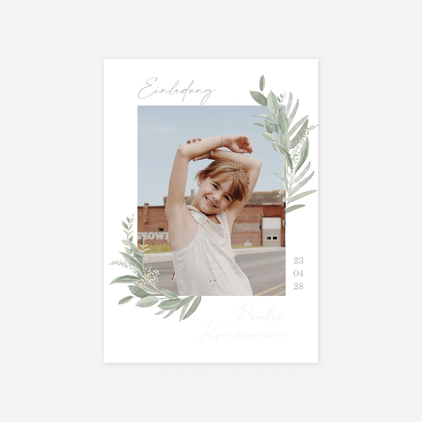Die Einladung zur Kommunion "Floraler Rahmen" setzt das Foto Ihres Kindes mit zarten, naturverbundenen Illustrationen liebevoll in den Mittelpunkt. Das zeitlose Design mit den filigranen Zweigen verleiht der Karte eine natürliche Eleganz, die perfekt zu diesem besonderen religiösen Fest passt. Jedes Exemplar wird mit größter Sorgfalt in unseren eigenen Ateliers in Deutschland und Frankreich für Sie gefertigt. Nutzen Sie unseren Online-Editor, um Ihre individuelle Karte ganz nach Ihren Wünschen zu gestalten und Ihre Gäste stilvoll zu informieren.
