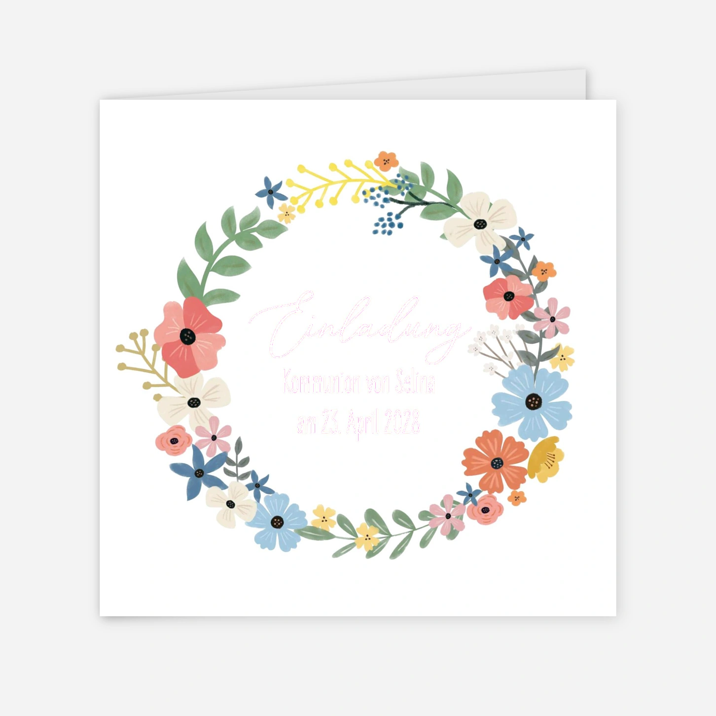 Die Einladungskarte "Freudenkranz" zur Kommunion strahlt mit ihrem farbenfrohen, handgezeichneten Blütenmeer pure Lebensfreude aus. Der filigrane Blumenkranz rahmt Ihre Einladungsworte auf herzliche Weise ein und macht diese Karte zum perfekten Vorboten für ein fröhliches Familienfest. In unseren hauseigenen Ateliers in Deutschland und Frankreich legen wir größten Wert auf präzise Druckverfahren und eine erstklassige Papierauswahl. Vertrauen Sie auf unsere langjährige Expertise, wenn Sie Ihre individuelle Einladung zur Kommunion gestalten. Erstellen Sie jetzt online Ihr persönliches Kartenset und teilen Sie diesen besonderen Meilenstein mit Ihren Liebsten.