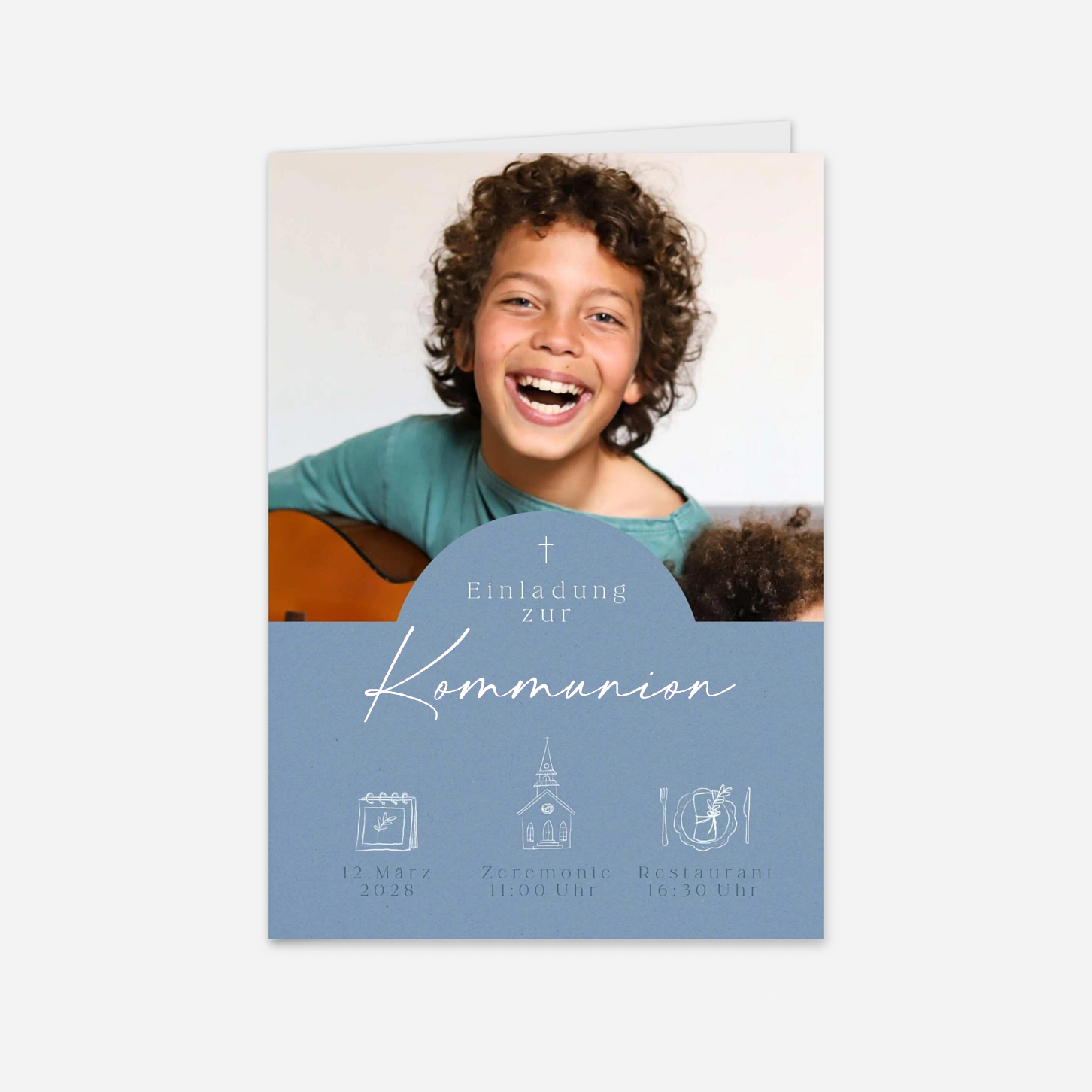Die Einladung zur Kommunion "Goldene Taube" besticht durch ihr modernes und zugleich herzliches Design, das das Foto Ihres Kindes strahlend in den Mittelpunkt rückt. Sanfte Illustrationen und eine elegante Typografie verleihen dieser Karte eine besondere Note, mit der Sie Ihre Liebsten stilvoll zu diesem bedeutenden Fest einladen können. Unsere hauseigenen Designer haben dieses Modell mit viel Liebe zum Detail entworfen, damit Ihre Post einen bleibenden Eindruck hinterlässt. Für ein perfektes Ergebnis wird jede Karte in unseren eigenen Druckereien auf hochwertigem Papier mit höchster Präzision gefertigt. Gestalten Sie Ihre persönlichen Einladungskarten zur Kommunion jetzt ganz einfach online in unserem Editor.