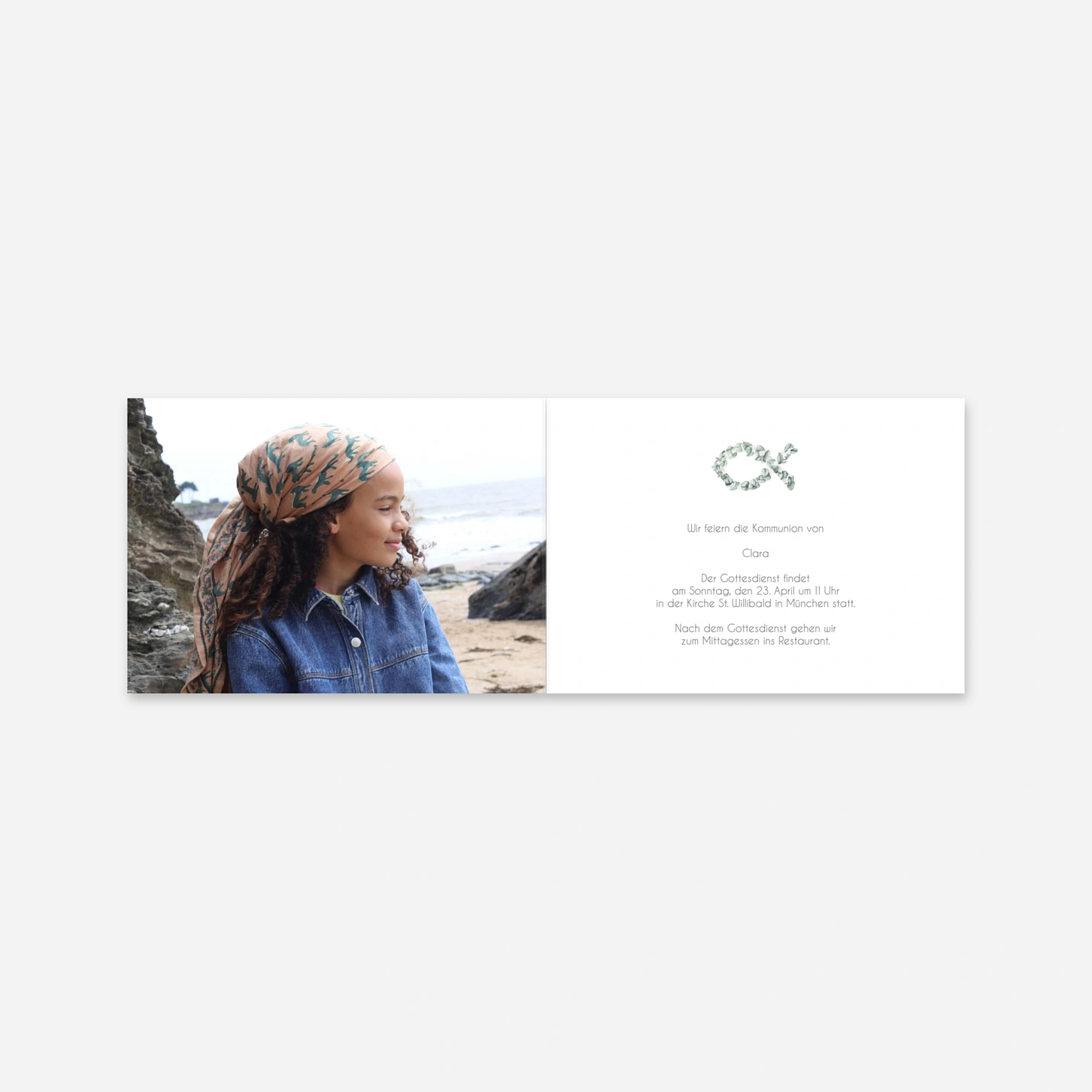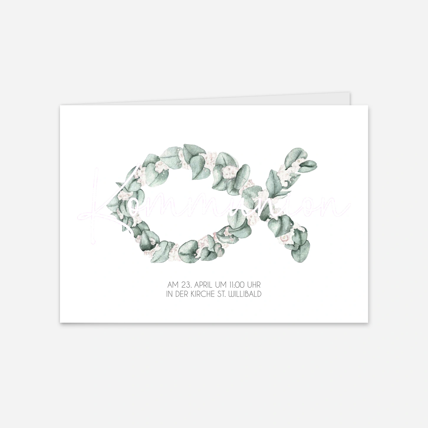 Die Einladungskarte "Goldener Ichthys" zur Kommunion besticht durch ihre natürliche Eleganz und die liebevoll gestaltete Kranz-Illustration in Fischform. Das harmonische Zusammenspiel aus zarter Typografie und botanischen Elementen verleiht Ihrer Einladung eine moderne sowie festliche Note. In unseren hauseigenen Ateliers legen wir größten Wert auf höchste Druckqualität, damit Ihre Postkarte zu einem ganz besonderen Erinnerungsstück für Ihre Gäste wird. Gestalten Sie Ihre Karte ganz einfach online und verleihen Sie ihr mit Ihren persönlichen Worten eine individuelle Note. Unser Team begleitet Sie mit Herzblut und Expertise bei der Vorbereitung Ihres großen Familienfestes.