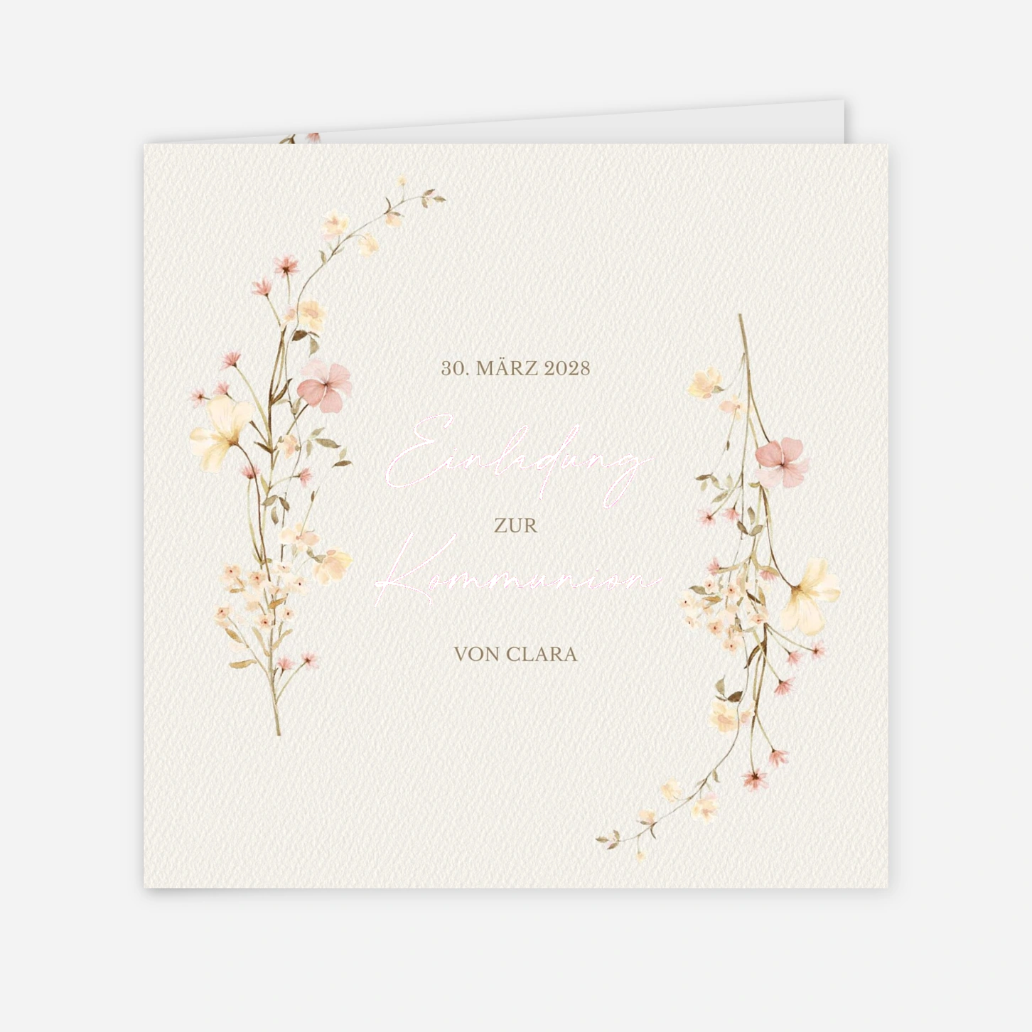 Die Einladungskarte zur Kommunion "Kleiner Segen" besticht durch ihr natürliches Design, das Ihr Kind mithilfe eines runden Foto-Ausschnitts liebevoll in den Mittelpunkt stellt. Filigrane, handgezeichnete Blumenranken umrahmen das Bild auf harmonische Weise und verleihen der Karte eine besonders zarte und festliche Note. In unseren hauseigenen Ateliers legen wir größten Wert auf eine präzise Druckqualität, damit Ihre Einladung zur Kommunion einen bleibenden Eindruck bei Ihren Gästen hinterlässt. Gestalten Sie Ihre persönlichen Karten jetzt ganz einfach online und profitieren Sie von unserer Leidenschaft für hochwertige Papierprodukte. Möchten Sie das gesamte Fest harmonisch abstimmen, finden Sie in unserem Sortiment auch die passenden Menü- und Tischkarten.