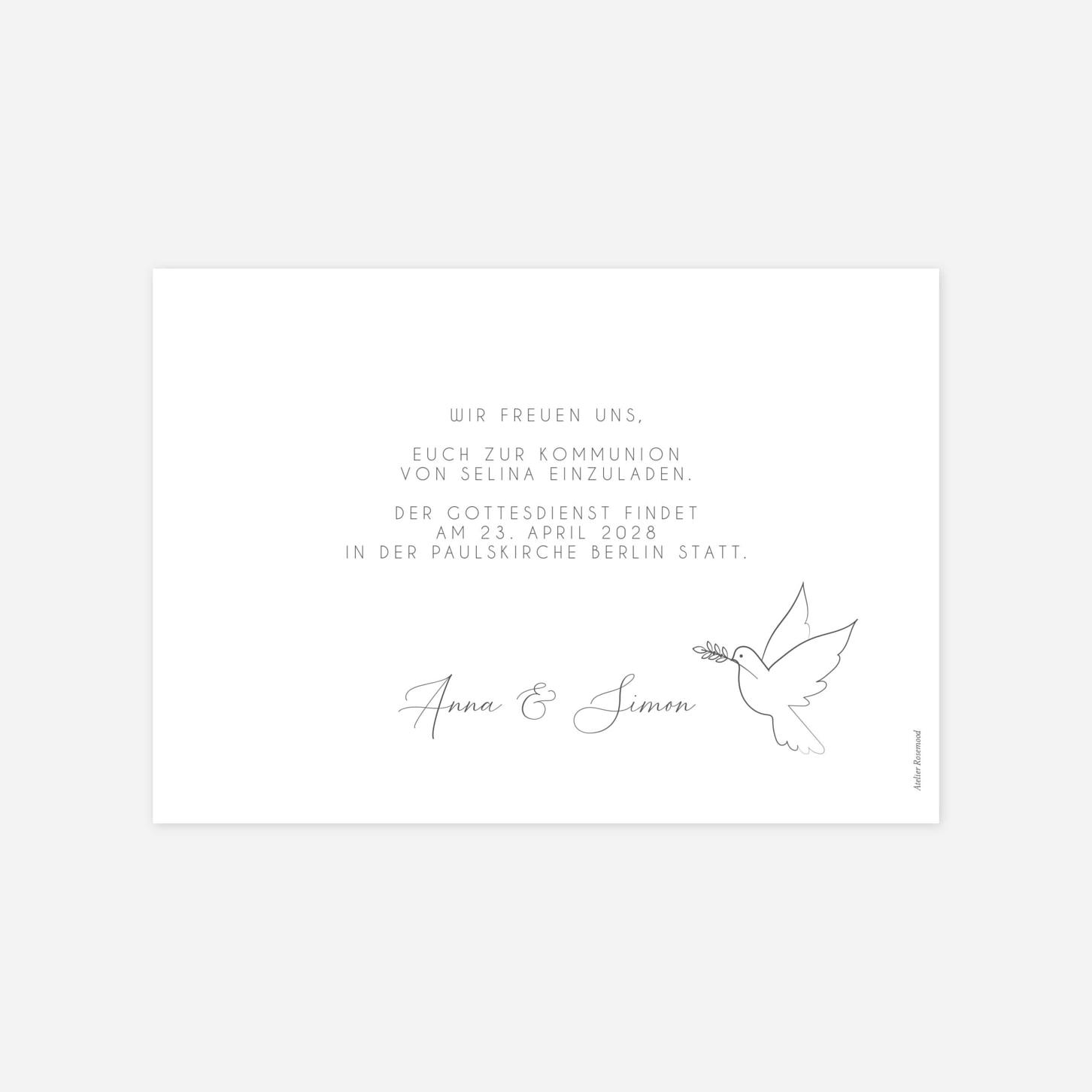 Die Einladungskarte zur Kommunion "Friedensgruß" besticht durch ihr feinsinniges Design, das eine zarte Taube mit einem goldenen Schriftzug kombiniert und so den feierlichen Anlass perfekt unterstreicht. In unserem hauseigenen Atelier entworfen, bietet dieses Modell viel Platz für ein herzliches Foto Ihres Kindes und Ihre persönlichen Worte an die Gäste. Dank der hochwertigen Druckqualität in unseren eigenen Produktionsstätten wird jede Karte zu einem wertvollen Erinnerungsstück für die ganze Familie. Gestalten Sie Ihre Einladungen zur Kommunion ganz einfach online und lassen Sie sich von unserer Papierauswahl begeistern.