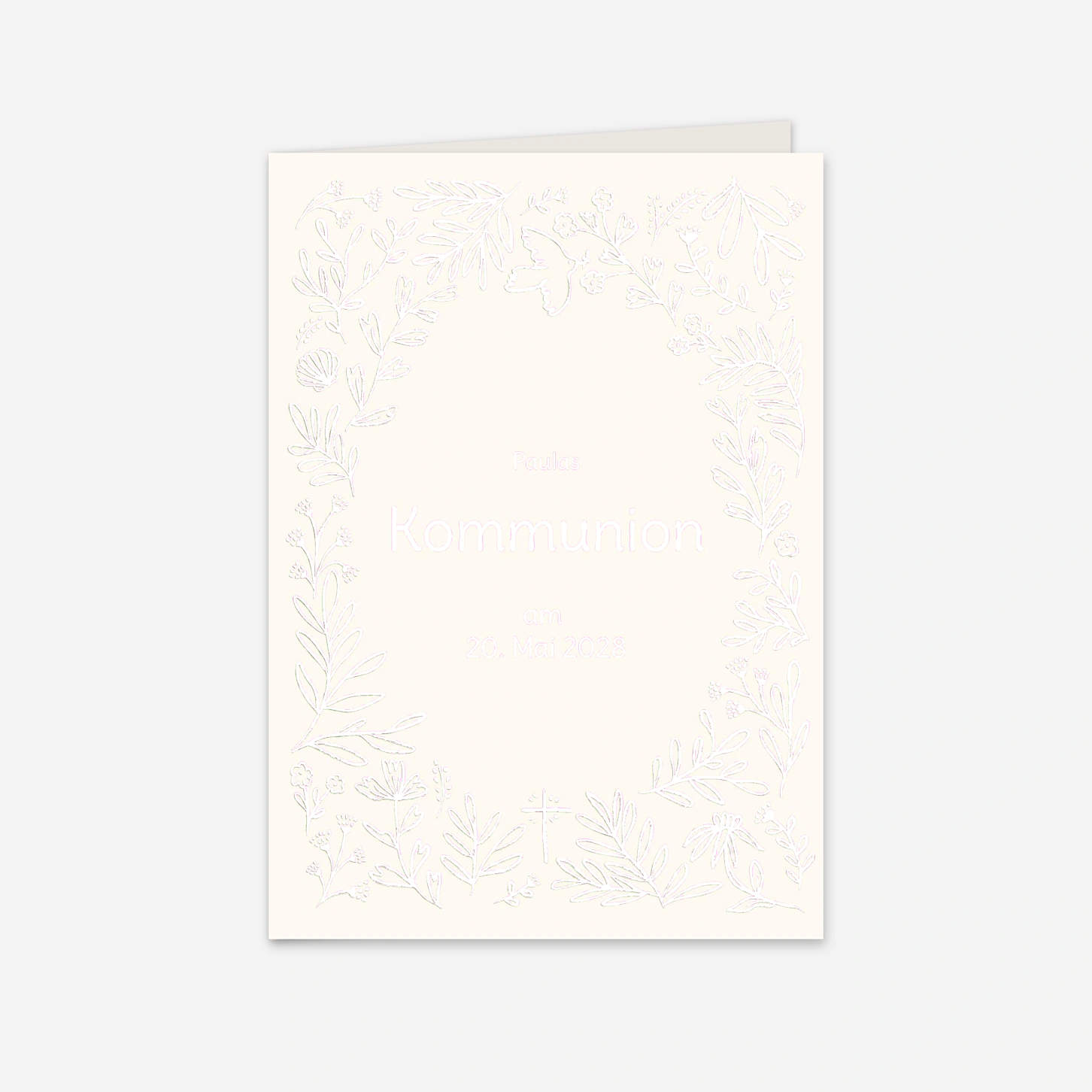 Die Einladung zur Kommunion "Wiesenzauber" besticht durch ihre filigranen Naturmotive, die einen eleganten Rahmen für Ihre persönlichen Worte bilden. Mit Symbolen wie der Friedenstaube und dem Kreuz fängt dieses Design die feierliche und zugleich leichte Stimmung dieses besonderen Tages wunderbar ein. In unseren hauseigenen Ateliers legen wir größten Wert auf eine präzise Druckqualität, damit Ihre Postkarte bei den Gästen einen bleibenden Eindruck hinterlässt. Gestalten Sie Ihre Einladung zur Kommunion jetzt ganz einfach online und verleihen Sie dem Fest Ihres Kindes eine ganz persönliche Note.