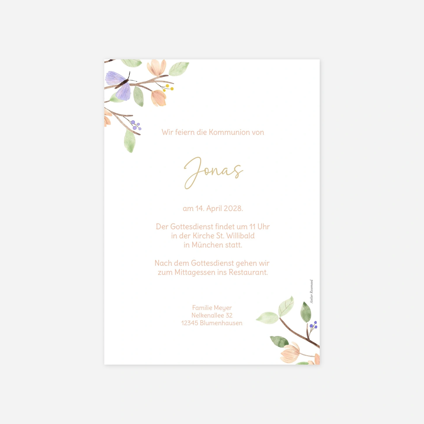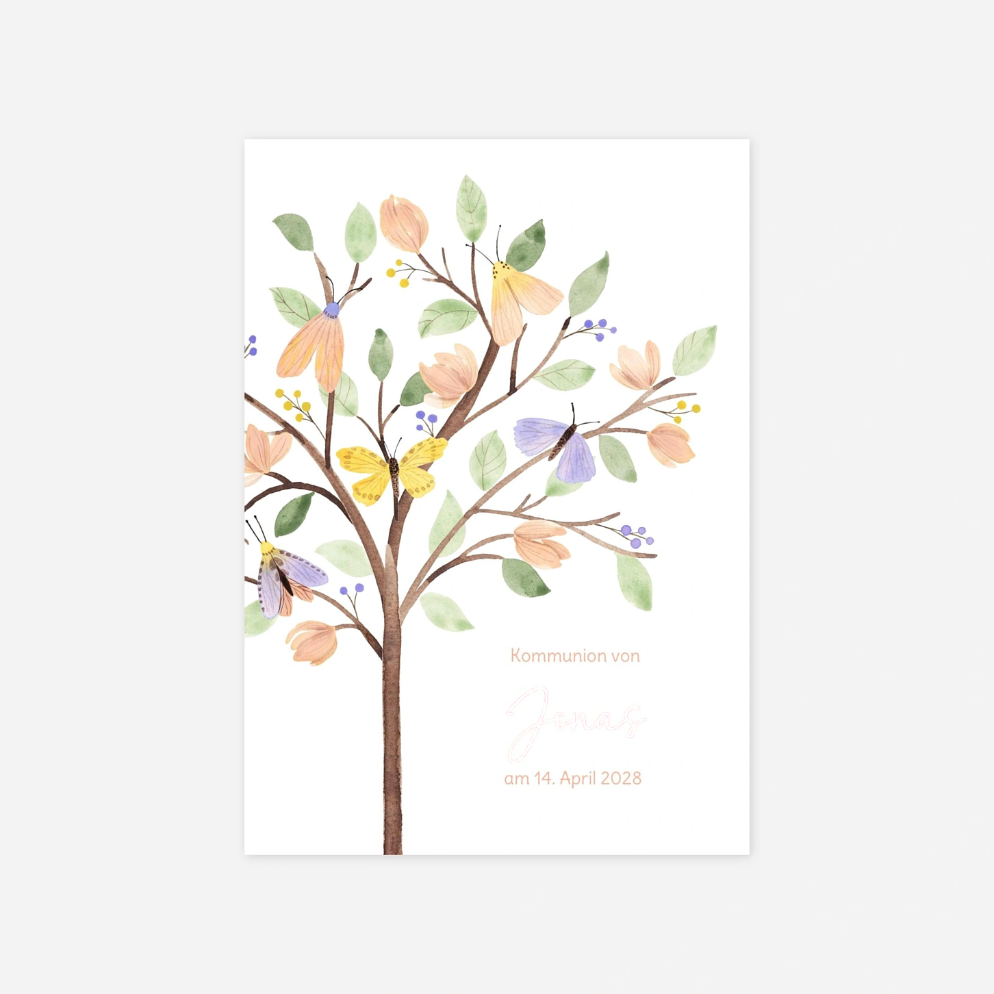 Die Einladung zur Kommunion "Zarter Lebensbaum" besticht durch ihre naturverbundene Leichtigkeit und die liebevoll gestalteten Illustrationen von Schmetterlingen und Blüten. Mit diesem harmonischen Design laden Sie Ihre Familie und Freunde auf besonders herzliche Weise zu diesem bedeutenden christlichen Fest ein. Unsere hauseigenen Designer haben dieses Motiv entworfen, um den besonderen Moment der ersten heiligen Kommunion Ihres Kindes stilvoll zu begleiten. Profitieren Sie bei der Gestaltung Ihrer Karten von unserer langjährigen Expertise und lassen Sie Ihre Einladungen in unseren eigenen Ateliers in höchster Qualität drucken. Gestalten Sie jetzt Ihr individuelles Set ganz einfach online in unserem Editor.