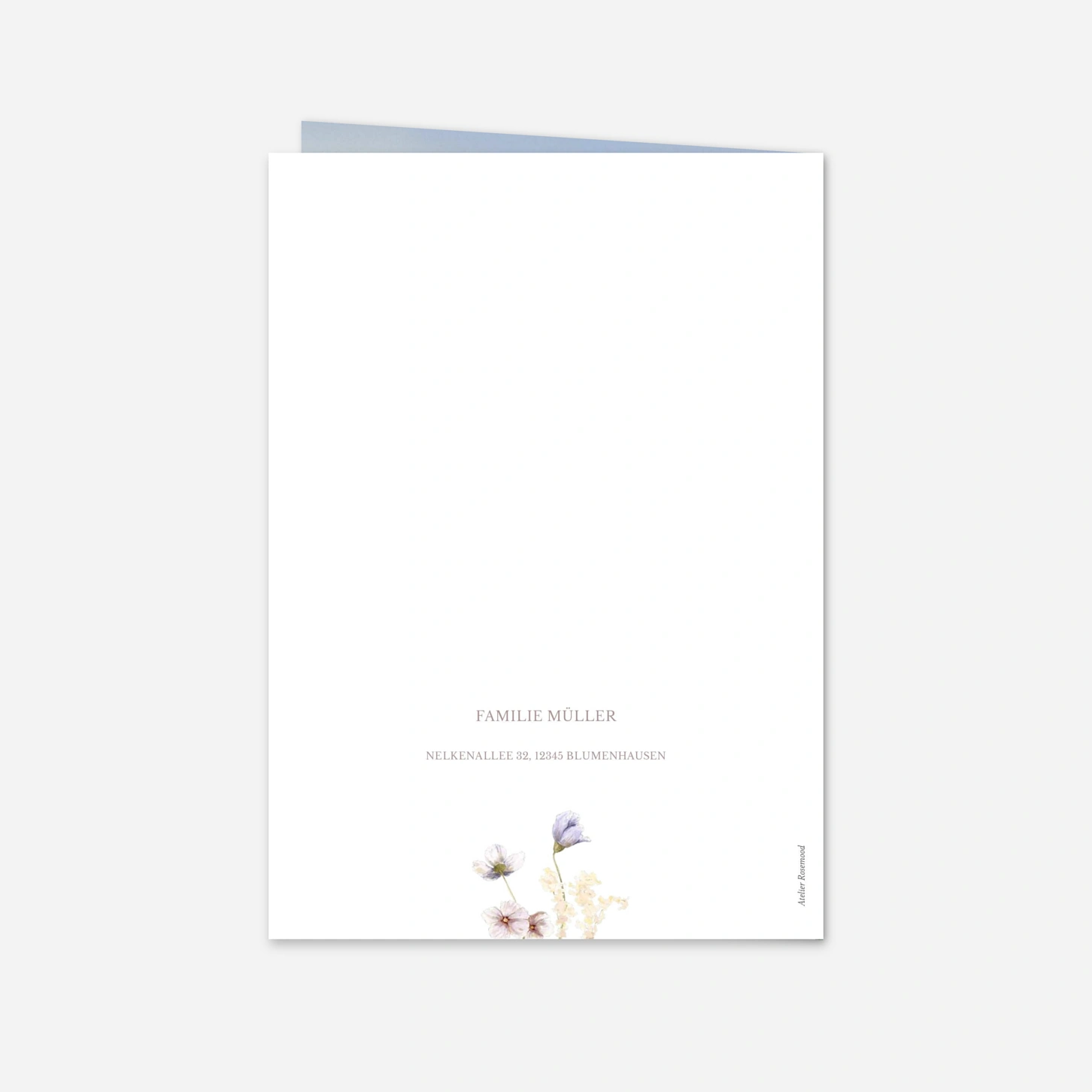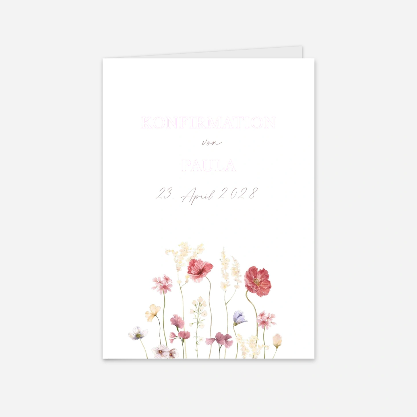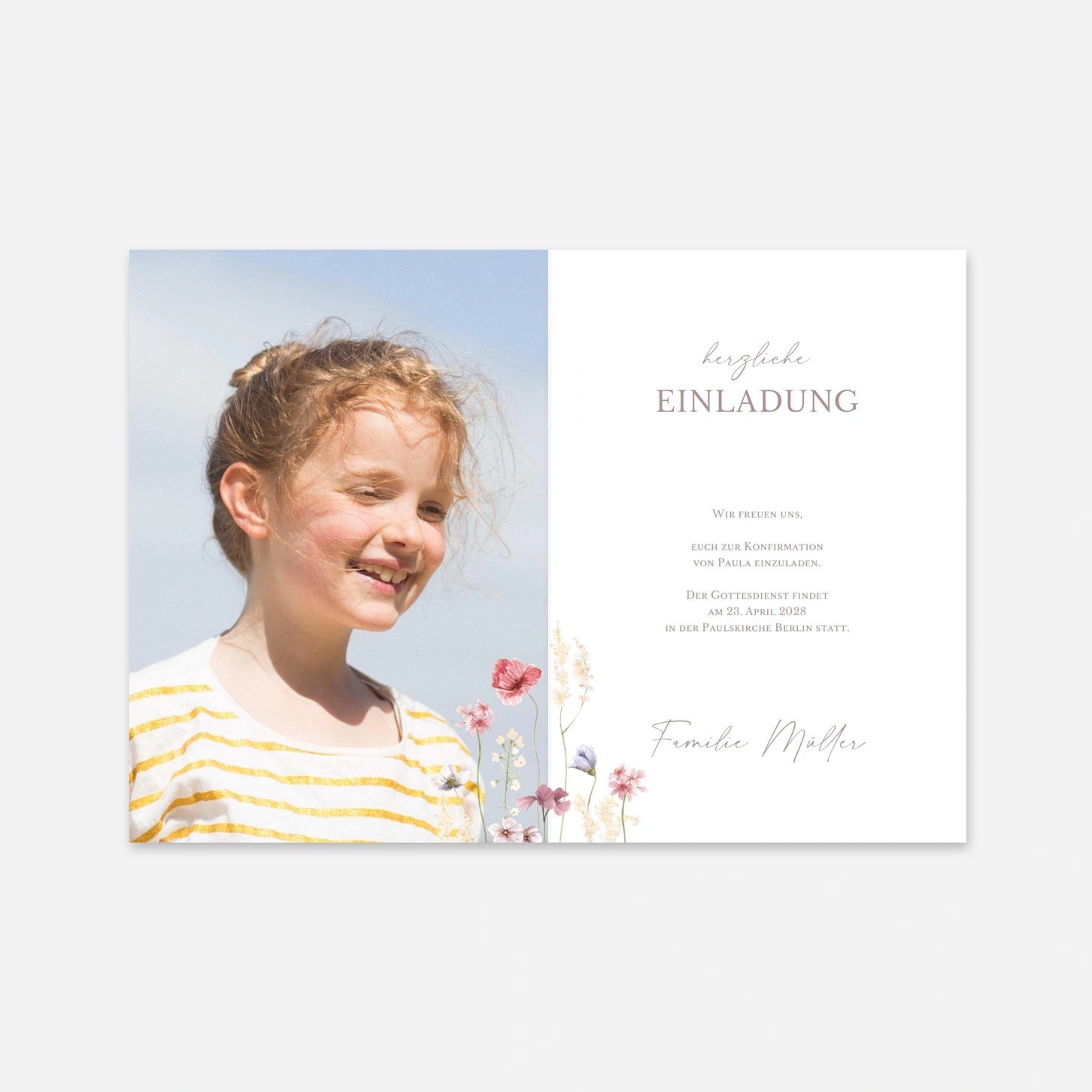 Die Konfirmationseinladung "Blütenharmonie" besticht durch ihre zarten, aquarellierten Wildblumen, die eine friedvolle und natürliche Atmosphäre für diesen besonderen Ehrentag schaffen. Das elegante Zusammenspiel aus moderner Typografie und floraler Leichtigkeit macht diese Karte zu einer stilvollen Wahl, um Freunde und Familie zu diesem bedeutenden Meilenstein einzuladen. Da uns die Qualität Ihrer Papeterie am Herzen liegt, fertigen wir jedes Exemplar mit höchster Präzision in unseren hauseigenen Ateliers in Deutschland und Frankreich. Lassen Sie sich von unseren hochwertigen Papieren inspirieren und gestalten Sie Ihre persönliche Einladung zur Konfirmation ganz einfach in unserem Online-Editor.