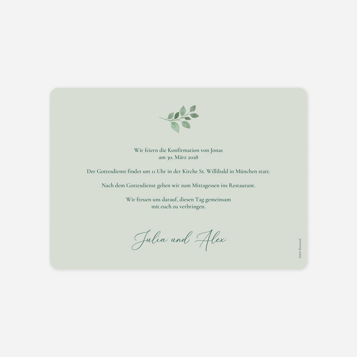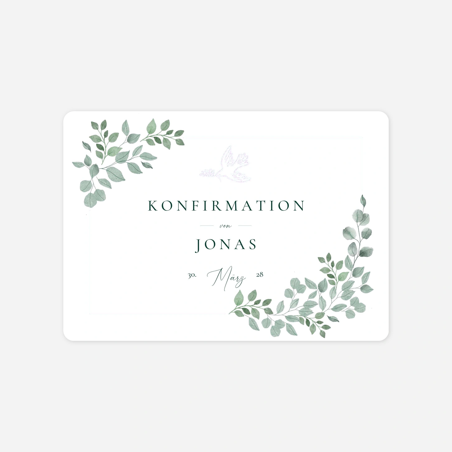 Die Einladung zur Konfirmation "Leichtigkeit" besticht durch ihre ruhige und natürliche Ästhetik, die durch zarte Aquarell-Illustrationen von Eukalyptuszweigen unterstrichen wird. Dieses elegante Design schafft einen stilvollen Rahmen für die Ankündigung dieses wichtigen religiösen Meilensteins und lädt Ihre Gäste auf besonders herzliche Weise ein. Wir produzieren Ihre Karten mit größter Sorgfalt in unseren hauseigenen Ateliers in Deutschland und Frankreich, um eine exzellente Druckqualität auf unseren hochwertigen Papieren zu gewährleisten. Vertrauen Sie auf unsere Expertise und Leidenschaft für schönes Design, wenn Sie Ihre individuelle Einladung zur Konfirmation gestalten. Möchten Sie direkt online loslegen und Ihre persönliche Karte mit nur wenigen Klicks erstellen?