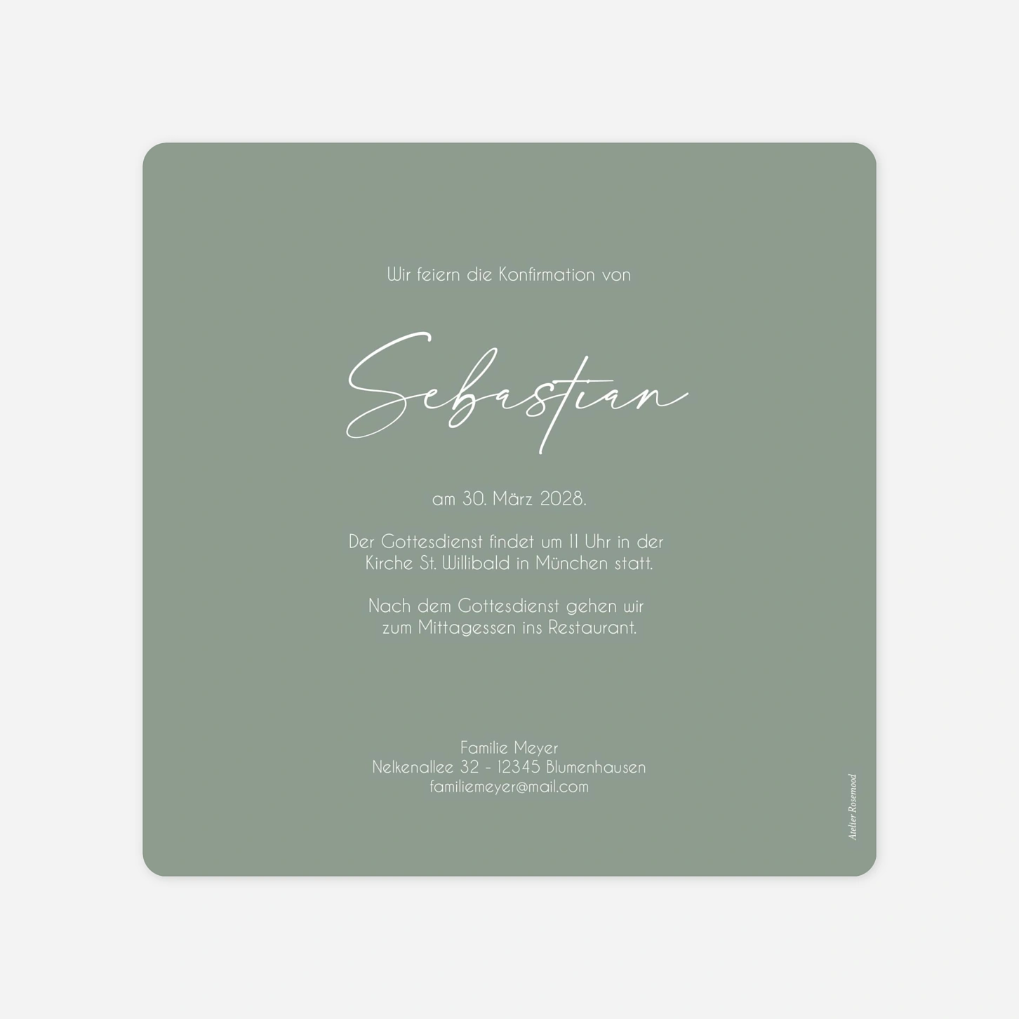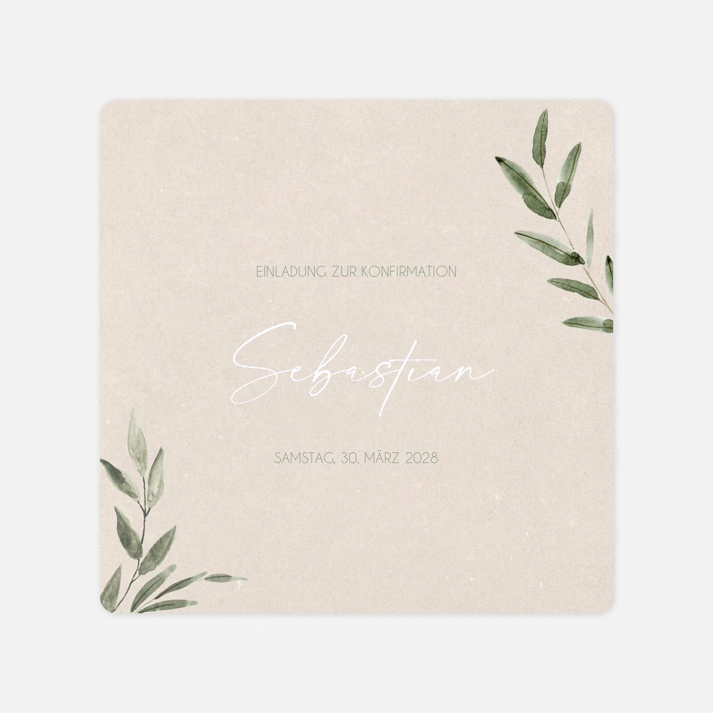 Die Konfirmationseinladung "Naturträume" besticht durch ihre ruhige und natürliche Ästhetik, die durch zarte Aquarell-Illustrationen von Olivenzweigen unterstrichen wird. Dieses elegante Design schafft einen stilvollen Rahmen für die Ankündigung dieses wichtigen religiösen Meilensteins und lädt Ihre Gäste auf besonders herzliche Weise ein. Wir produzieren Ihre Karten mit größter Sorgfalt in unseren hauseigenen Ateliers in Deutschland und Frankreich, um eine exzellente Druckqualität auf unseren hochwertigen Papieren zu gewährleisten. Vertrauen Sie auf unsere Expertise und Leidenschaft für schönes Design, wenn Sie Ihre individuelle Einladung zur Konfirmation gestalten. Möchten Sie direkt online loslegen und Ihre persönliche Karte mit nur wenigen Klicks erstellen?