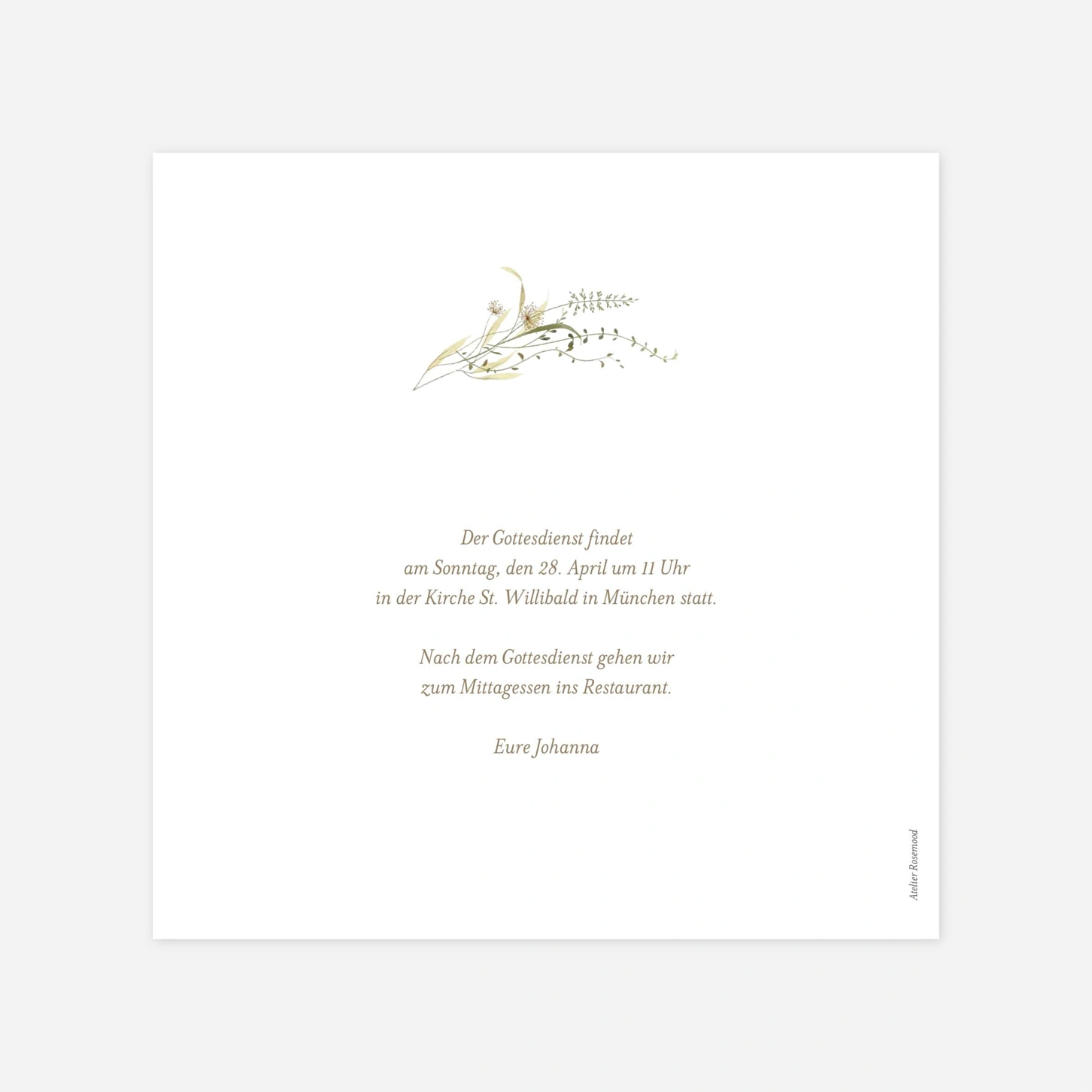 Die Einladung zur Konfirmation "Zarter Blütenkranz" besticht durch ihre naturverbundene Ästhetik, die durch filigrane Illustrationen von Gräsern und Wiesenblumen unterstrichen wird. Dieses elegante Design schafft einen feierlichen Rahmen für die Ankündigung dieses wichtigen religiösen Meilensteins und lässt sich wunderbar mit einem persönlichen Foto Ihres Kindes im Innenteil ergänzen. Wir produzieren Ihre Karten mit höchster Präzision in unseren hauseigenen Ateliers in Deutschland und Frankreich, um eine exzellente Druckqualität auf unseren hochwertigen Papieren zu garantieren. Vertrauen Sie auf unsere Expertise und Leidenschaft für schönes Design, wenn Sie Ihre individuelle Einladung zur Konfirmation gestalten. Möchten Sie direkt online loslegen und Ihre persönliche Karte mit nur wenigen Klicks erstellen?