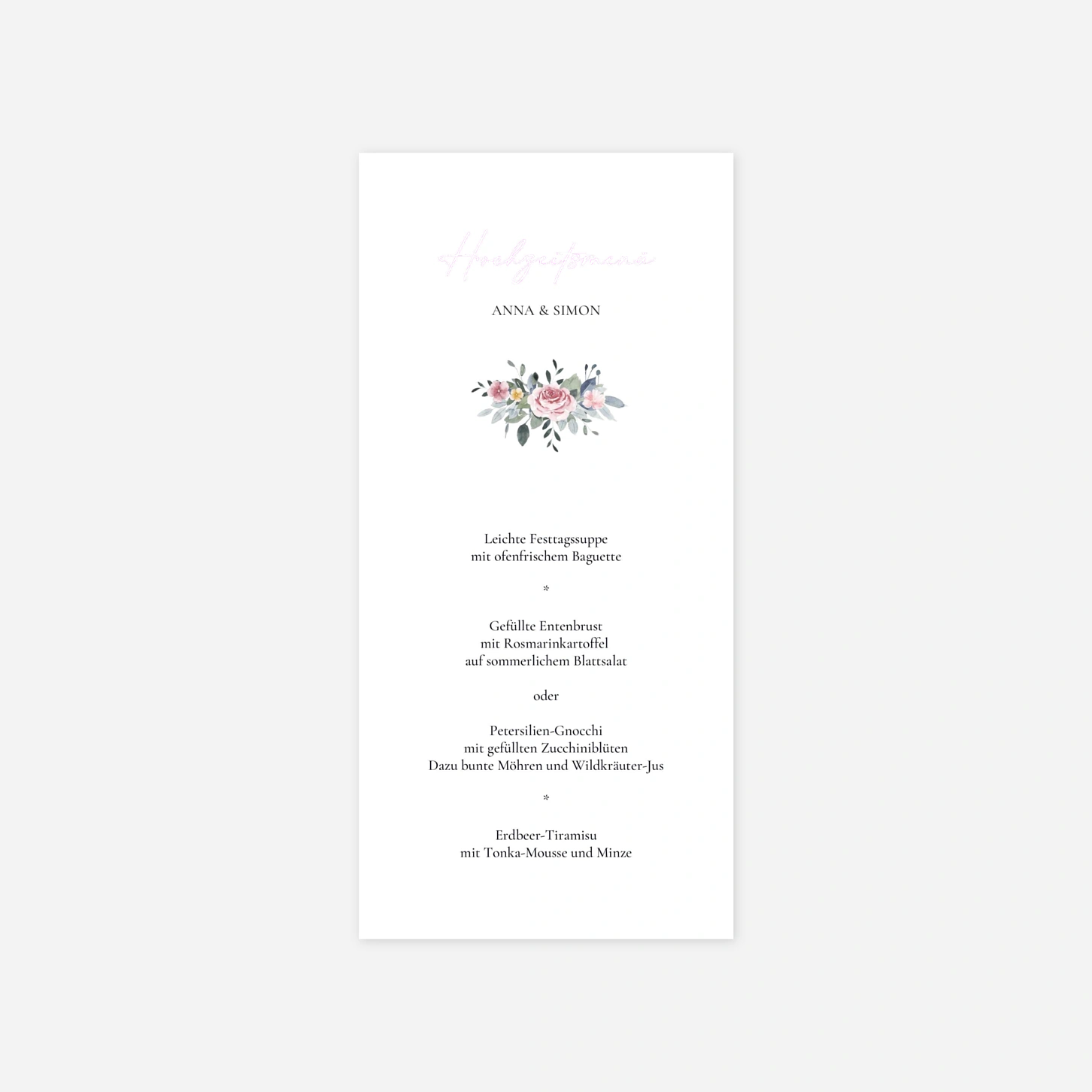 Die Menükarte "Herzensnähe" begleitet Ihre Gäste geschmackvoll durch den Abend. Sie rundet das Tischbild ab und informiert auf elegante Weise über die kulinarischen Highlights Ihrer Hochzeit.