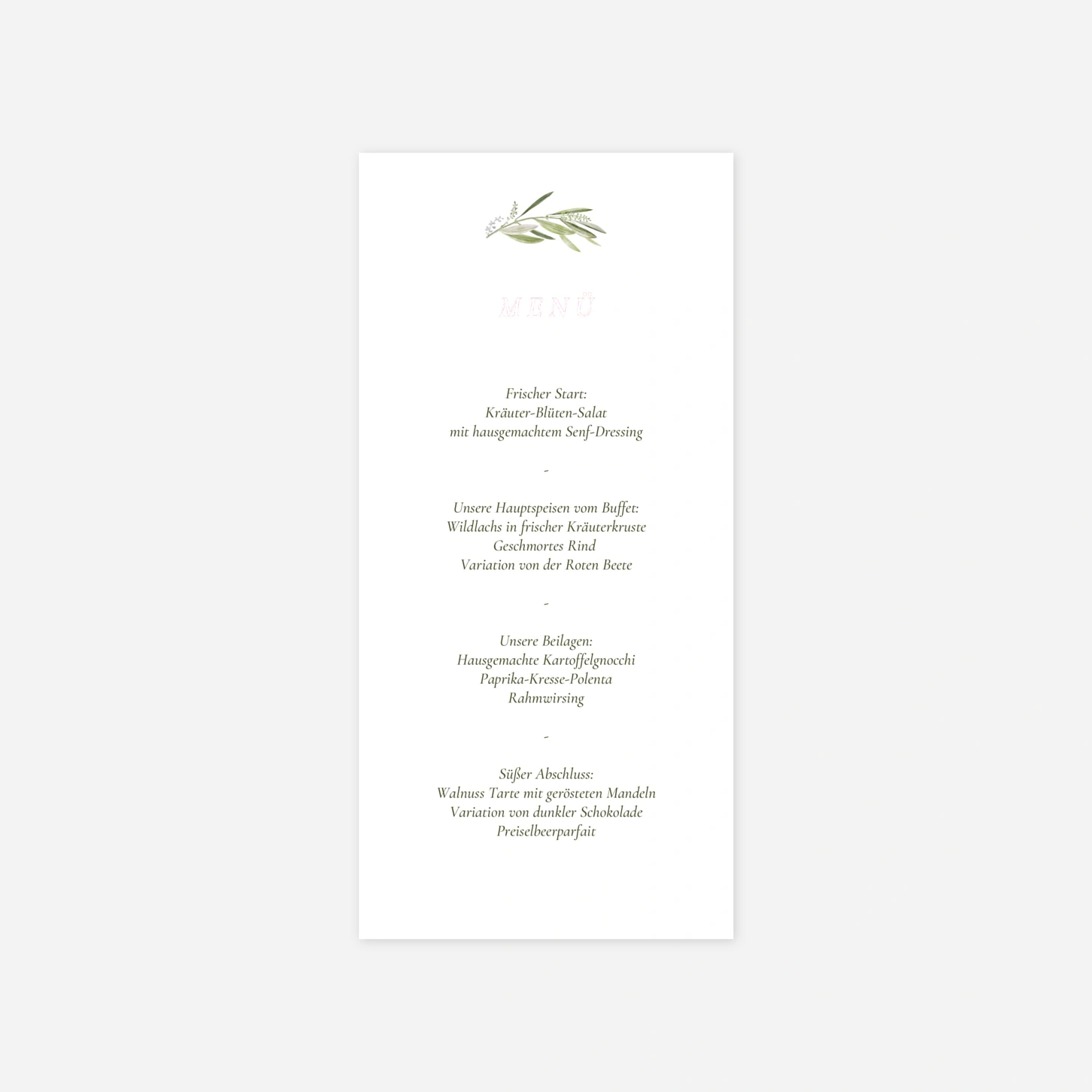 Die stilvolle Menükarte "Olivenkranz" verleiht jeder Hochzeit oder besonderen Feier eine exklusive Note. Das schlichte, minimalistische Design wird durch eine zarte florale Illustration ergänzt und setzt Ihr kulinarisches Angebot perfekt in Szene.
