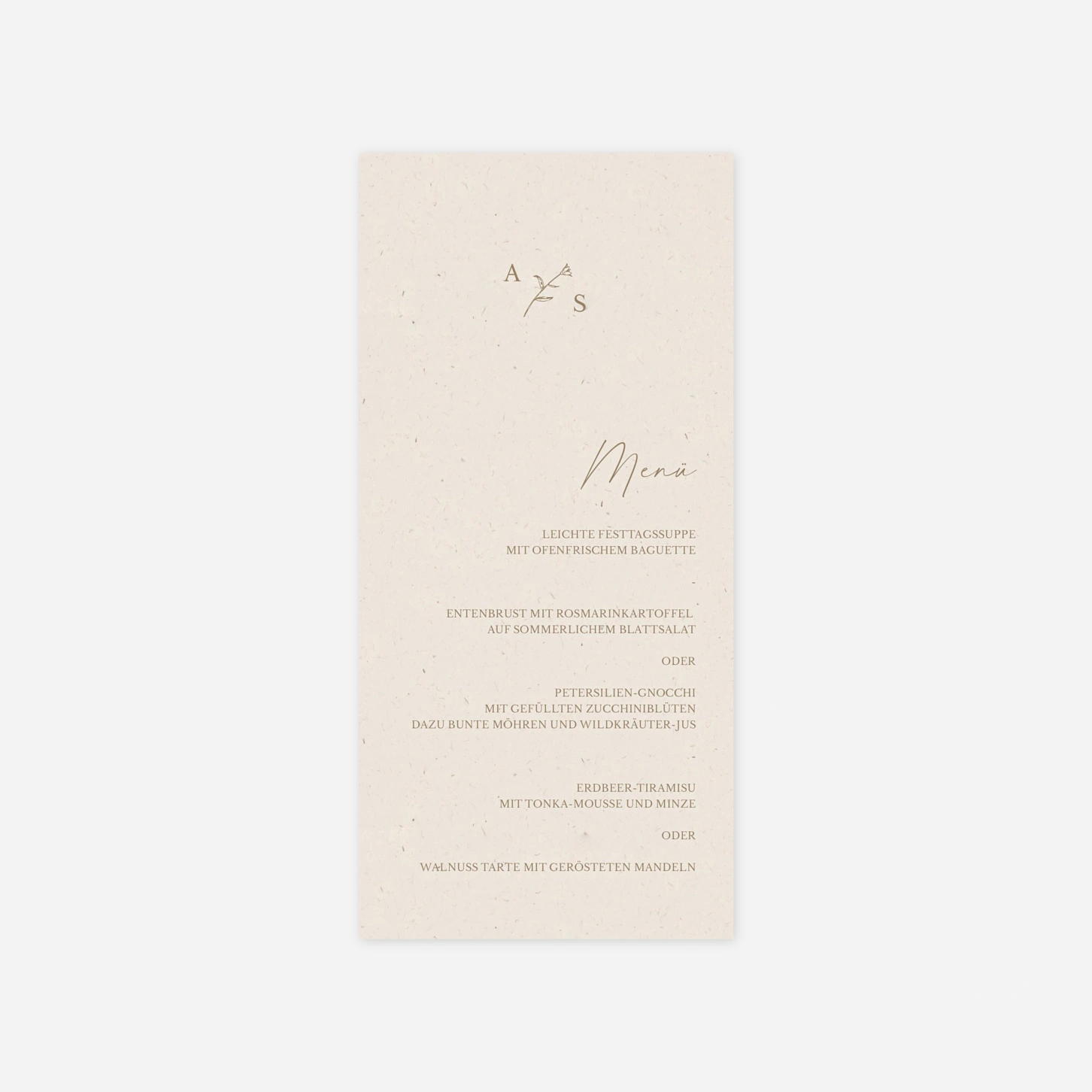 Die Menükarte "Passepartout" begleitet Ihre Gäste geschmackvoll durch den Abend. Sie rundet das Tischbild ab und informiert auf elegante Weise über die kulinarischen Highlights Ihrer Hochzeit.