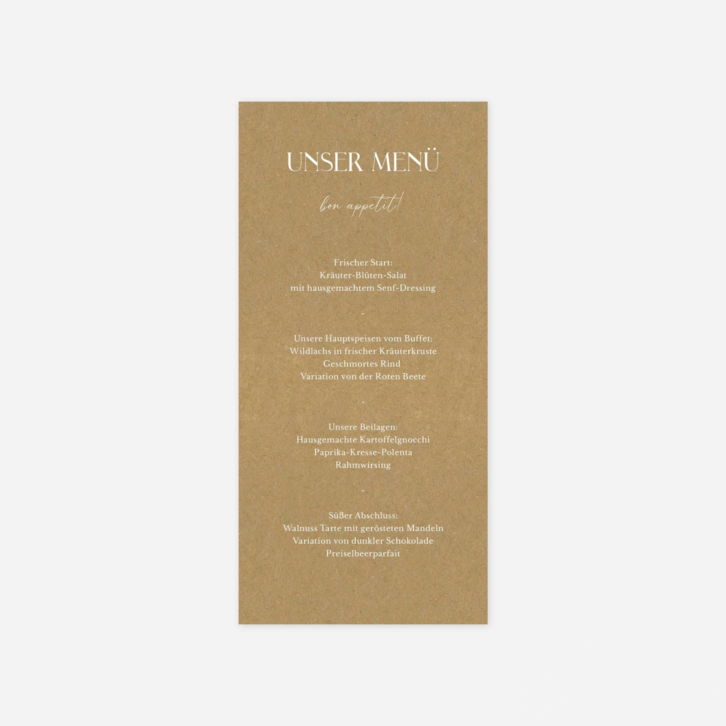 Die stilvolle Menükarte "Wir im Glück" verleiht Ihrer Hochzeit oder Feier eine elegante und natürliche Note. Die harmonische Typografie setzt das Festmahl stilvoll in Szene und lädt Ihre Gäste dazu ein, sich auf ein kulinarisches Erlebnis zu freuen. Die hochwertige Gestaltung sorgt für eine edle Tischdekoration und schafft eine harmonische Verbindung zwischen Dekor und Genuss. Lassen Sie Ihre Gäste bereits beim Blick auf die Menükarte die Vorfreude auf ein unvergessliches Festmahl spüren.