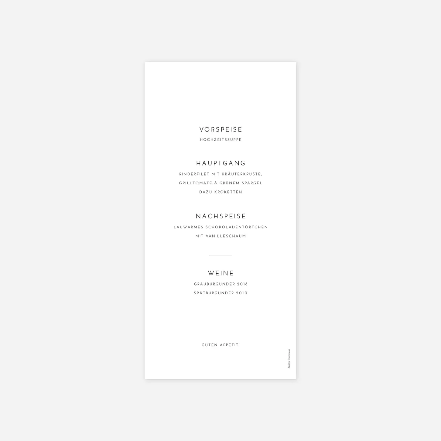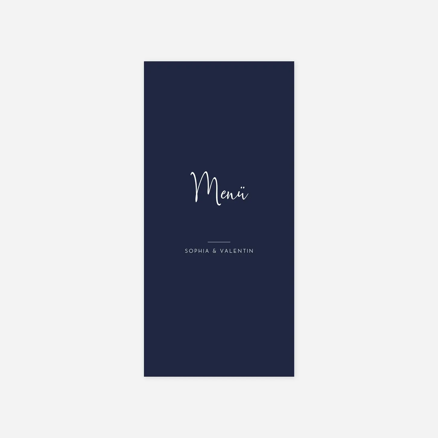 Präsentieren Sie Ihren Hochzeitsgästen auf die stilvollste Art und Weise mit unserer Menükarte Zeitgeist. Die klassische Kollektion wurde von unserem hauseigenen Kreativteam designt und überzeugt durch klare Linien und satte Farben. Die zweiseitige Menükarte ist 100% personalisierbar und kann dank unserer Toolbar von der Schriftart bis hin zur -farbe individuell angepasst werden. Entscheiden Sie sich zwischen den drei angebotenen Farbvarianten: Die Menükarte Zeitgeist ist in klassischem weiß, frischem grün oder einem satten dunkelblau verfügbar. Auf der Vorderseite finden Sie ein mittig platziertes Textfeld, in das Sie die Worte Ihrer Wahl einfügen können. Auf der Rückseite finden Sie außerdem genügend Platz, um Ihren Gästen das gesamte Menü schmackhaft zu machen. Von der Nachspeise bis zum Dessert - für jeden Gang ist genug Platz auf unserer Menükarte Zeitgeist. Für alle Fragen rund um unsere Produkte oder Ihre Bestellung steht Ihnen unser engagierter Kundenservice immer gerne per E-Mail, Chat oder Telefon zur Verfügung.