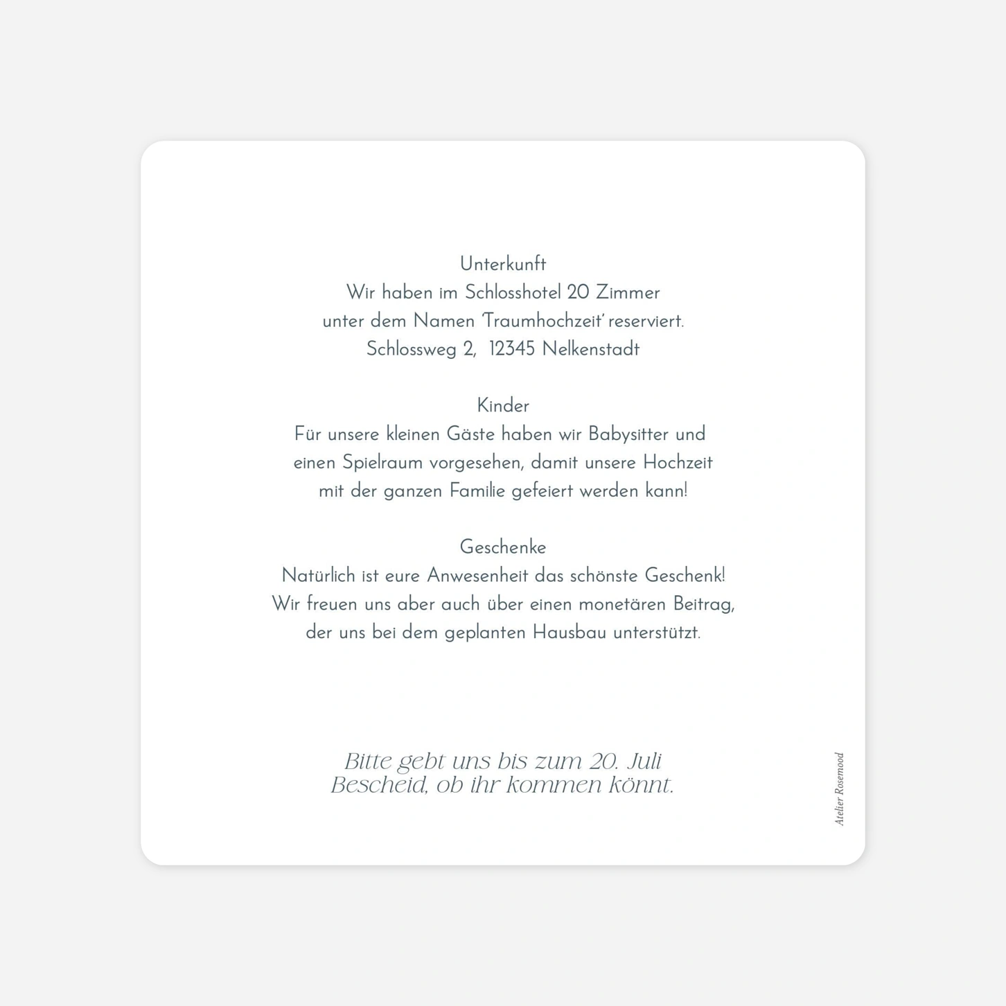 Mit der Beilegekarte "Meeresflüstern" geben Sie Ihren Gästen zusätzliche Informationen zur Feier weiter – ob Ablauf, Dresscode oder Übernachtungstipps. Ein stilvolles Extra, das Ihre Einladung perfekt ergänzt.