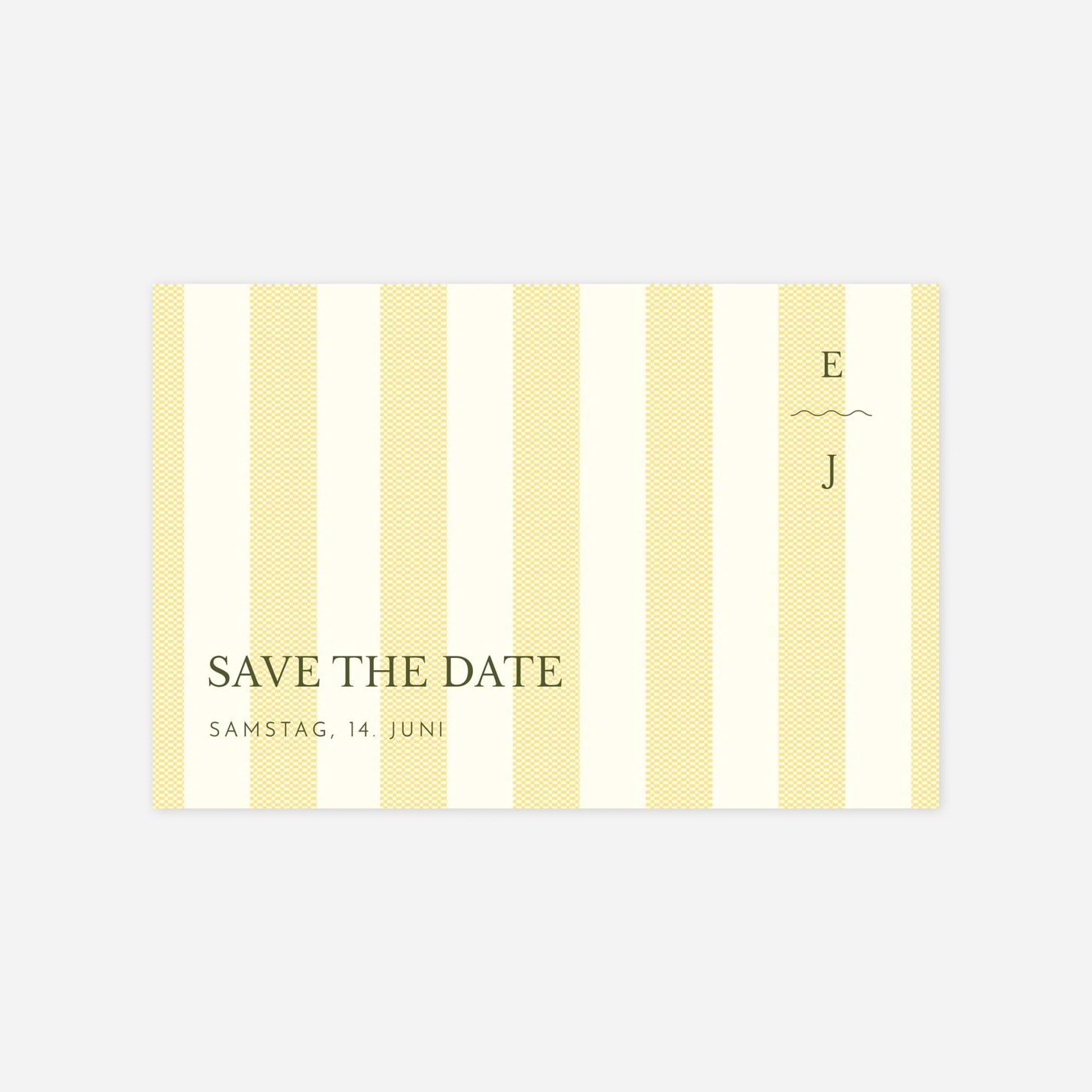 Überraschen Sie Ihre Gäste mit der Save-the-Date-Karte "Dolce Amore" und lassen Sie sie frühzeitig an Ihrer Vorfreude teilhaben. Mit ihrem sommerlichen Design in feinen hellblauen oder gelben Streifen und einer modernen, zeitlosen Typografie setzt diese Karte den perfekten ersten Akzent für Ihre Hochzeit. Eine frühzeitige Ankündigung sorgt dafür, dass alle wichtigen Menschen an Ihrem großen Tag dabei sein können. Machen Sie den ersten Schritt in Richtung Traumhochzeit mit einer Karte, die Leichtigkeit, Stil und italienischen Charme vereint!