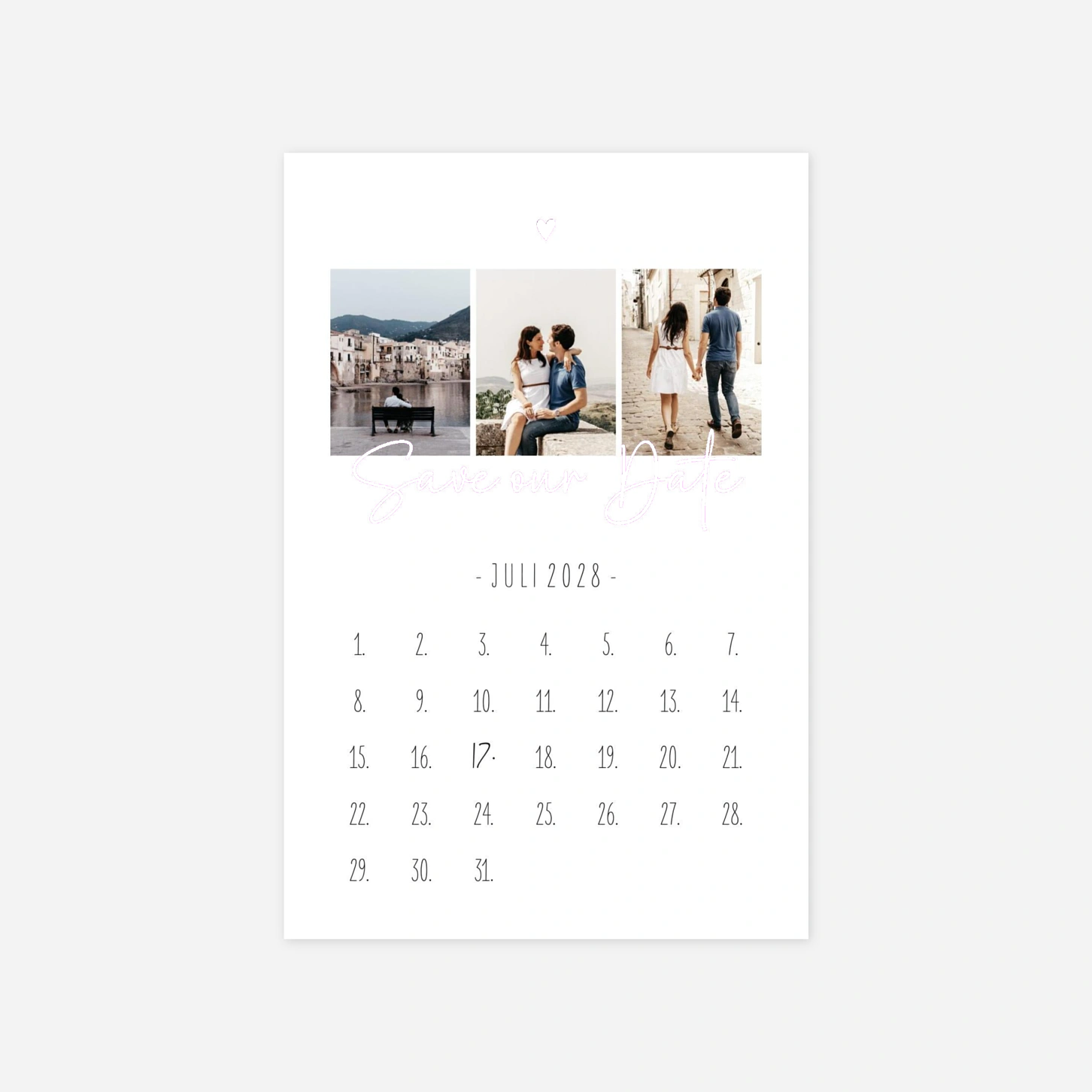 Die stilvolle Save-the-Date Karte Herzensbilder kombiniert moderne Eleganz mit einer persönlichen Note. Liebevoll ausgewählte Fotos schmücken diese Karte und erzählen Ihre individuelle Liebesgeschichte. Ein kleines Herz symbolisiert Liebe und Zusammengehörigkeit, während die klar strukturierte Gestaltung für Übersichtlichkeit sorgt. Mit dieser Karte kündigen Sie Ihre Hochzeit nicht nur stilvoll, sondern auch mit liebevollen Details an. Sie ist ideal für Paare, die ihre einzigartigen Momente in den Mittelpunkt stellen möchten und gleichzeitig ein modernes, hochwertiges Design bevorzugen. Eine perfekte Wahl für unvergessliche Erinnerungen!