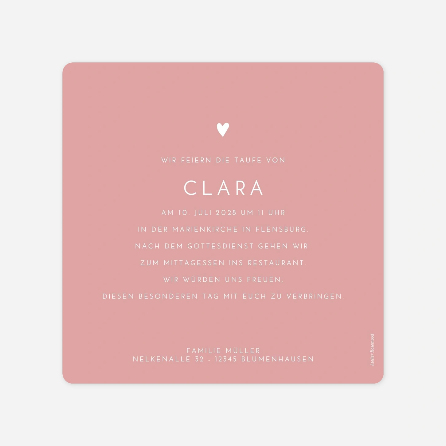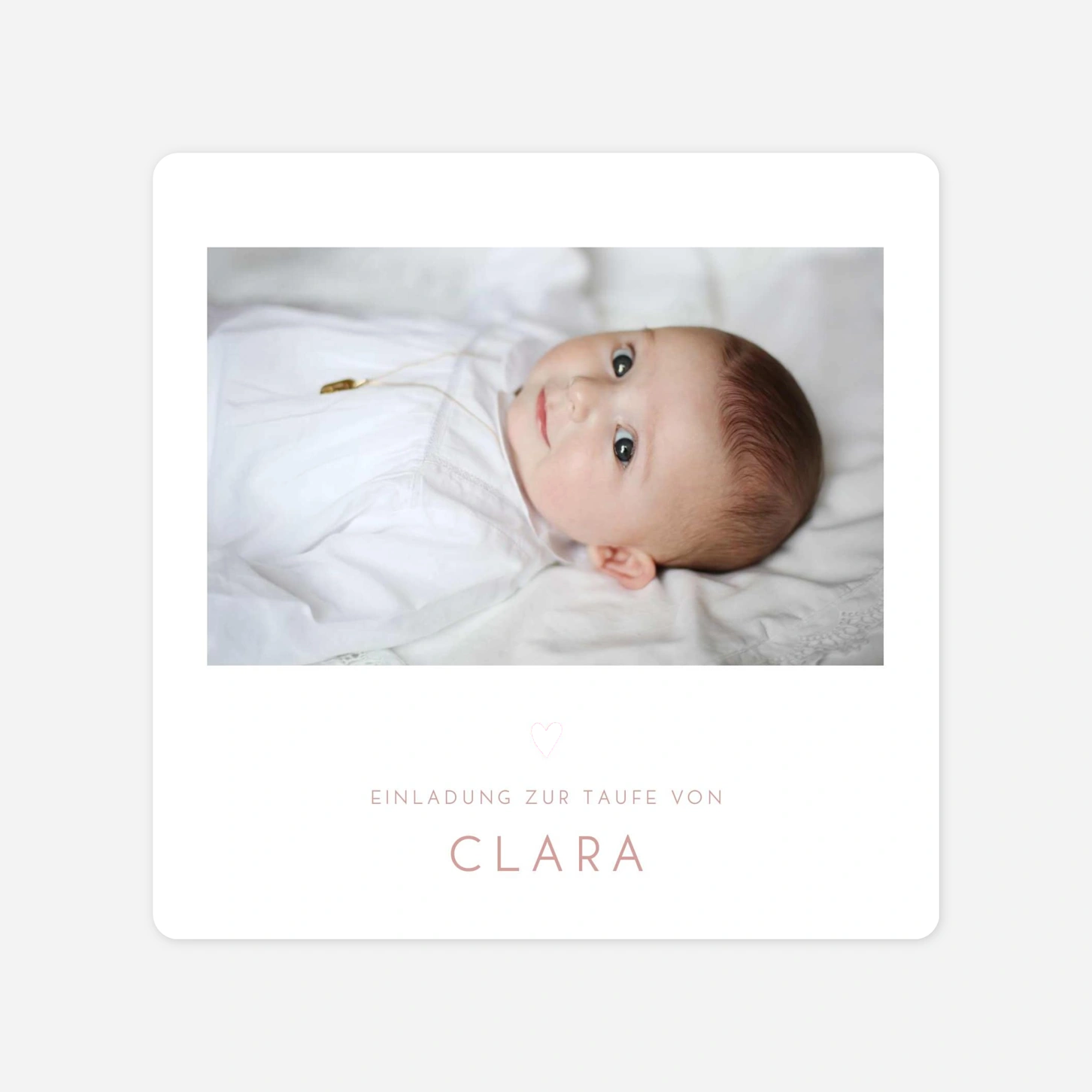 Mit der Taufeinladung Elegant Herz (Gold) Klappkarte wählen Sie eine wunderschöne, schlichte Einladungskarte zur Taufe, die durch kleine Details einen Hauch von Eleganz versprüht. Auf dieser Taufeinladung kommt die Hauptperson der Taufe mit dem Polaroid-Effekt besonders gut zur Geltung. Setzen Sie eines Ihrer schönsten Fotos auf der Vorderseite ein und wählen Sie für das Herz und die Schrift ein stilvolles Rosa oder ein sanftes Türkis. Kontaktieren Sie für die Papierwahl Ihrer Karte unseren freundlichen Kundendienst, wir helfen Ihnen gerne weiter. Sie können die Taufeinladung ganz einfach direkt online selbst gestalten.