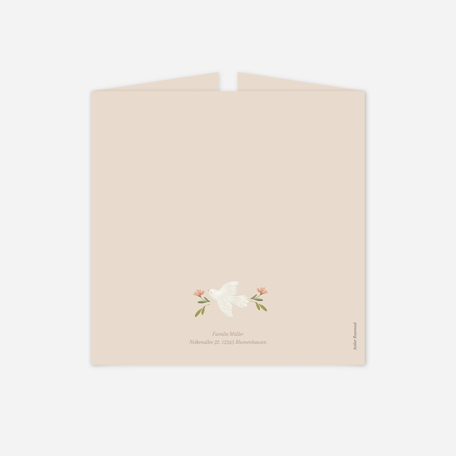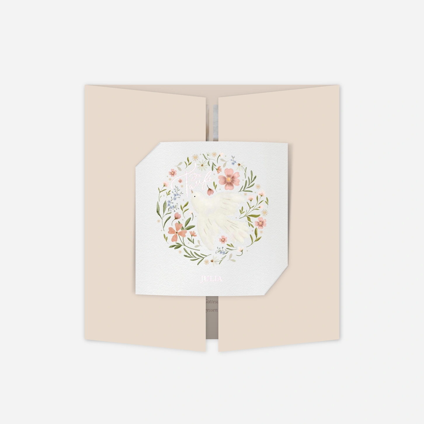Die Taufeinladung "Fotoprägung" kündigt dieses schöne Sakrament mit einer poetischen Sanftheit an – rund um eine zarte Taube, fein umrahmt von Blattwerk und Blumen. Diese Einladung zur Taufe mit zeitlosem Charme lässt sich ganz einfach mit Ihren eigenen Worten personalisieren, um das Wesentliche mit Ihren Liebsten zu teilen. Mit Sorgfalt auf unseren Premium-Papieren gedruckt, in unseren eigenen Ateliers in Frankreich und Deutschland, bringt dieses Modell jedes Detail der Illustration besonders schön zur Geltung. Ideal, wenn Sie eine personalisierte Taufeinladung im Tauben-Stil suchen, die Sie jetzt online gestalten können.