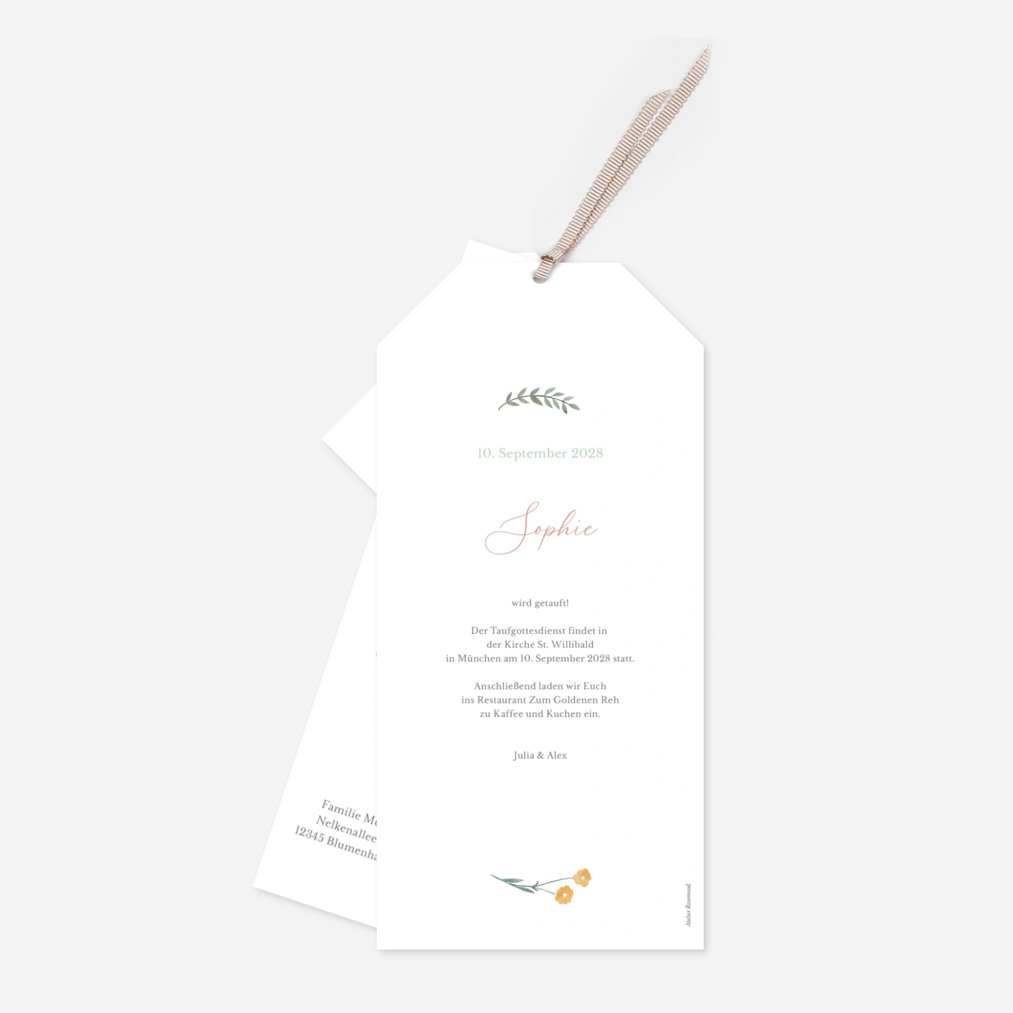 Die Taufkarte „Kleine Blüte“ verbindet zarte Illustrationen mit einer liebevollen Bildsprache und schafft so einen besonders harmonischen Rahmen für die Einladung zur Taufe. Florale Motive und ein symbolisches Kreuz verleihen der Karte eine ruhige, natürliche Ausstrahlung, während Ihre Fotos das Tauffest persönlich begleiten. Wenn Sie Ihre Taufkarte gestalten oder eine Einladung zur Taufe drucken lassen möchten, profitieren Sie von einem Design, das in unserem Atelier entworfen und in unseren eigenen Produktionsstätten in Deutschland und Frankreich gefertigt wird. Gestalten Sie Ihre Karte ganz nach Ihren Wünschen und laden Sie Ihre Liebsten stilvoll zu diesem besonderen Tag ein.