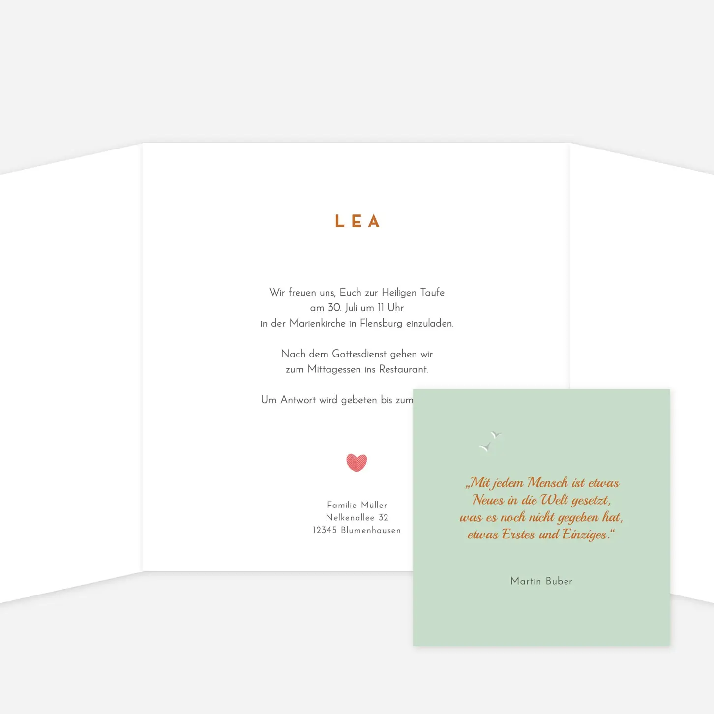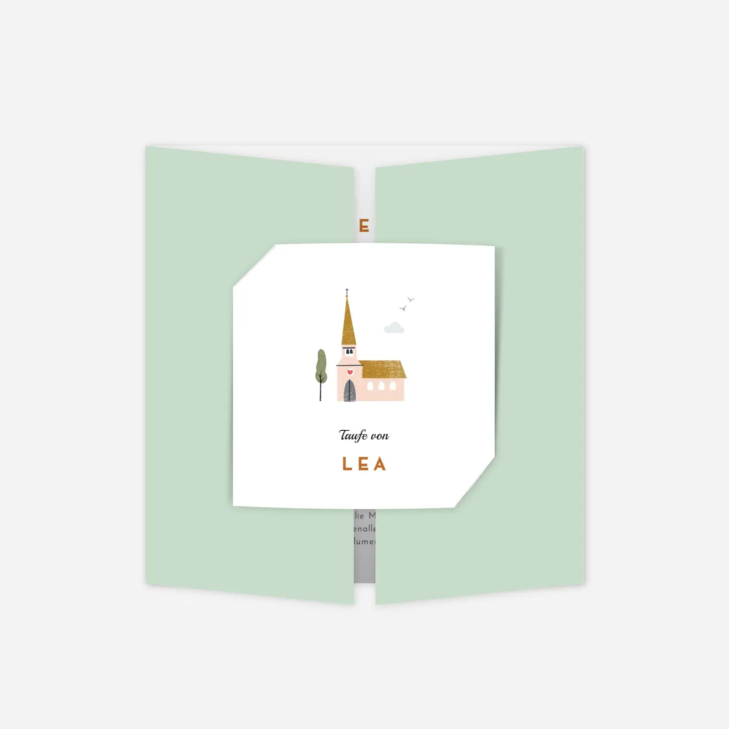 Die Kleine Kirche (Duo) Taufeinladung ist ideal, um die baldige Taufe Ihres Kindes stilvoll und raffiniert zu verkünden. Dieses elegante Modell mit der hübschen Zeichnung von unserer Designerin La Petite Alma ist in drei Farben erhältlich. Wählen Sie diejenige, die am besten zu Ihnen passt: Lieber ein zartes Rosa, federleichtes Blau oder ein sanftes Grün? Das Besondere an dieser Taufeinladung ist, dass das Bild vorne eingesteckt ist. Der oder die glückliche Empfänger(in) nimmt es behutsam heraus, um dann die beiden Seiten wie ein Tor zu Ihrer persönlichen Nachricht zu öffnen. Mithilfe unseres Online-Editors können Sie Ihre Taufeinladung dann ganz nach Ihren Belieben personalisieren. Fügen Sie ein schönes Foto Ihres Kindes, die Infos und vielleicht ein passendes Zitat zu Ihrer Taufeinladung hinzu. Nehmen Sie gerne Kontakt zu uns auf, wenn Sie Fragen oder Kommentare zu unseren verschiedenen Modellen moderner Taufeinladungen haben. Unsere Kundenberater beantworten gerne alle Ihre Anfragen. Sie können sie per E-Mail, Telefon oder per Chat direkt auf unserer Website erreichen. Wir verfolgen Ihr Design von A bis Z, von der Kreation bis zum Versand. Bestellen Sie eine kostenlose Einzelprobe, um die Qualität unserer Taufeinladungen Kleine Kirche zu überprüfen.