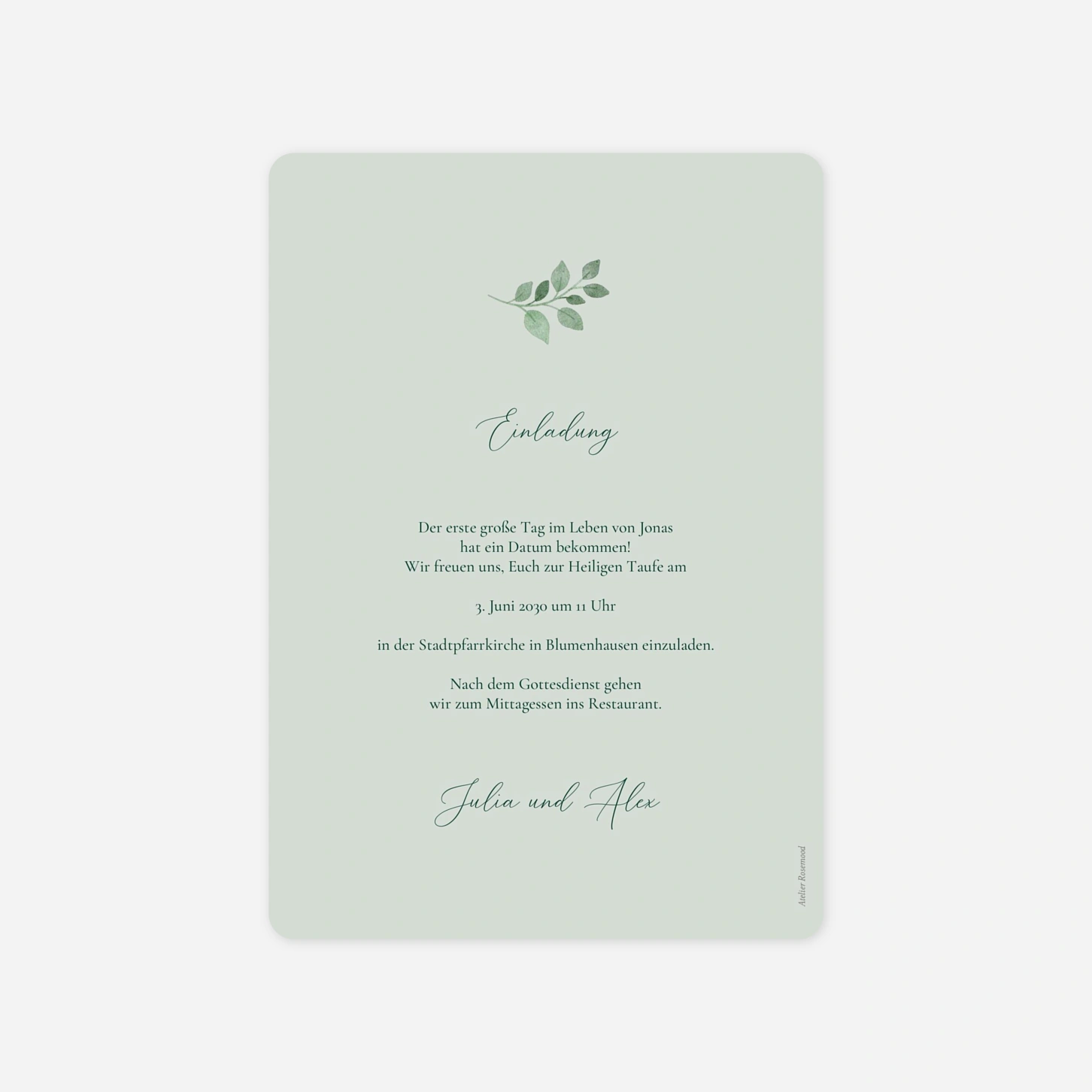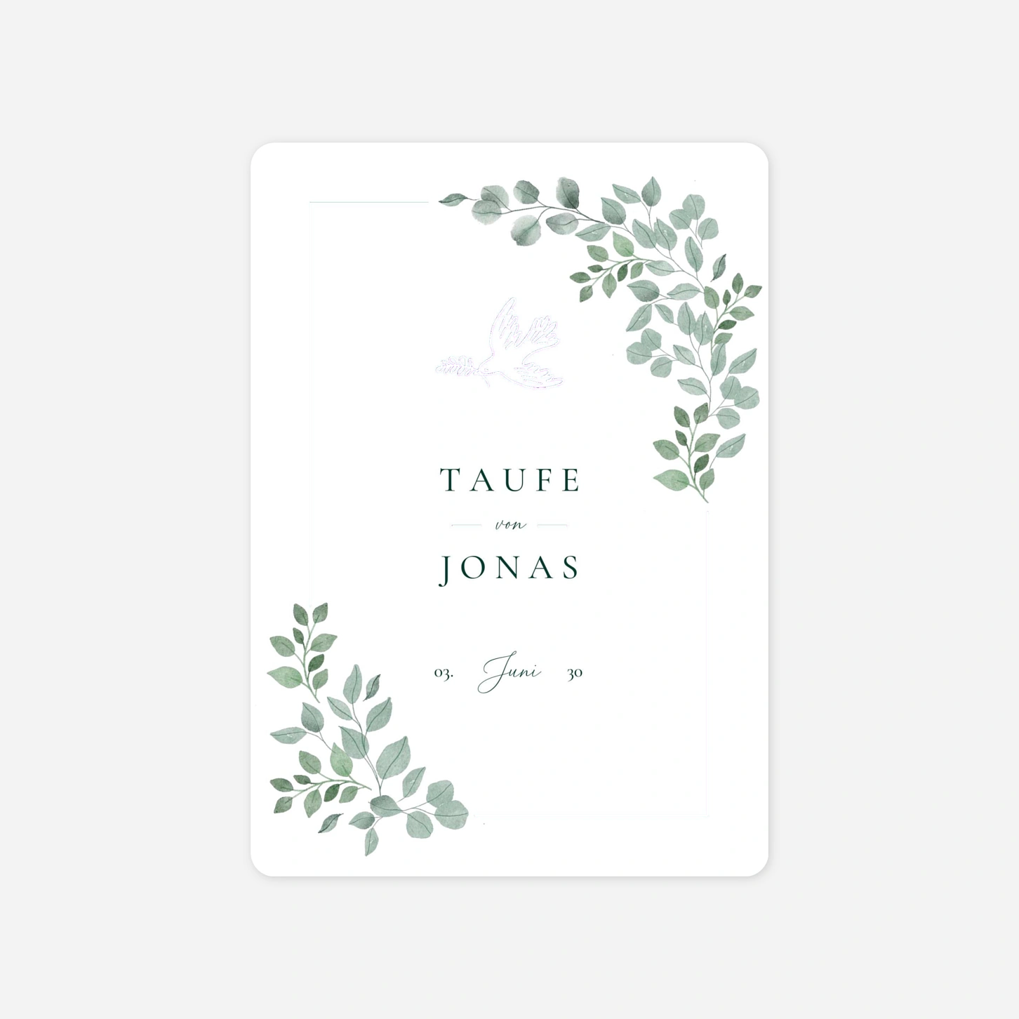 Die Taufkarte „Leichtigkeit“ verbindet eine ruhige Bildsprache mit zeitloser Symbolik und begleitet die Taufe Ihres Kindes auf besonders sanfte Weise. Zarte Illustrationen und eine klare Typografie verleihen dieser Einladung zur Taufe eine moderne, zugleich feierliche Ausstrahlung. Ideal für alle, die ihre Taufkarte gestalten und persönlich sowie stilvoll halten möchten. Wie alle unsere Designs wurde auch diese Taufkarte in unserem Atelier entworfen und in unseren eigenen Produktionsstätten in Deutschland und Frankreich gefertigt. Gestalten Sie Ihre Einladung jetzt online und lassen Sie Ihre Taufkarte drucken.