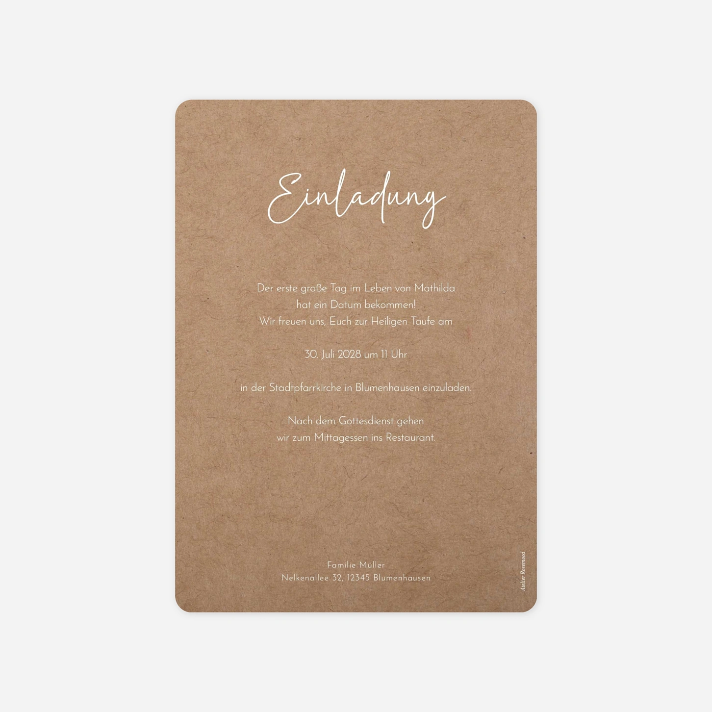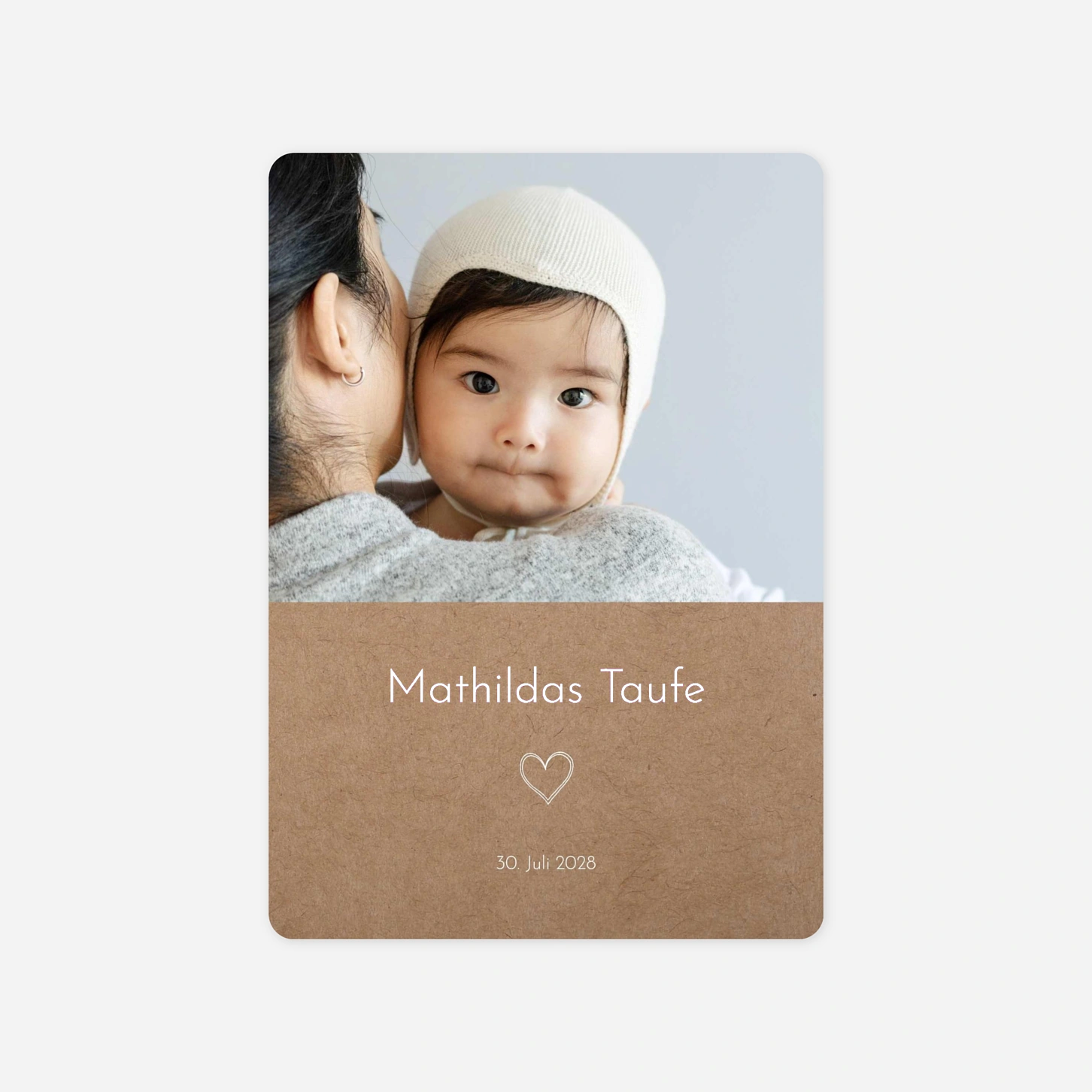Die Taufkarte „Licht und Segen“ verbindet schlichte Eleganz mit einer warmen, persönlichen Bildsprache und schafft einen liebevollen Rahmen für die Einladung zur Taufe. Das großzügig platzierte Foto steht im Mittelpunkt und verleiht der Taufkarte eine besonders emotionale Note, die Familie und Freunde berührt. Gestalten Sie Ihre Taufkarte ganz einfach online und lassen Sie Ihre Einladung zur Taufe drucken – entworfen in unserem Atelier und mit viel Sorgfalt in unseren eigenen Produktionsstätten in Deutschland und Frankreich gefertigt. Entdecken Sie, wie schön es sein kann, eine Taufkarte zu gestalten, die diesen besonderen Moment stilvoll begleitet.