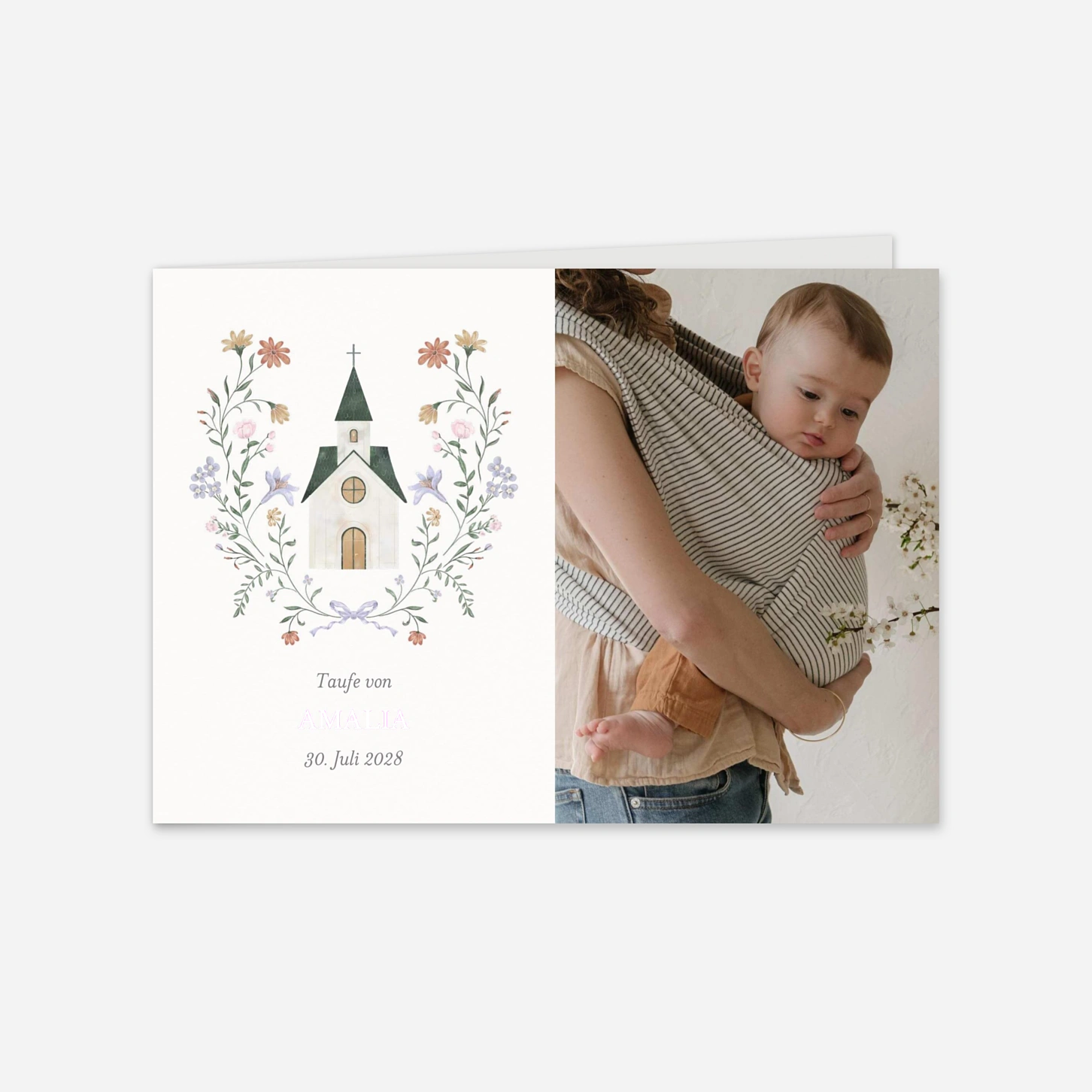 Die Taufeinladung "Liebevolle Freude" empfängt Ihre Gäste mit einer liebevollen Illustration, die den besonderen Zauber dieses Tages wunderbar einfängt. Die zarten Motive wirken ruhig und harmonisch und begleiten Ihr persönliches Foto auf besonders stimmige Weise. Wenn Sie Ihre Taufeinladung gestalten, profitieren Sie von unserer eigenen Produktion in Deutschland und Frankreich sowie von präzisem Druck auf hochwertigen Papieren. Eine stimmungsvolle Wahl für alle, die ihre Einladung zur Taufe drucken lassen und dabei Wert auf einen behutsam gestalteten Look legen.