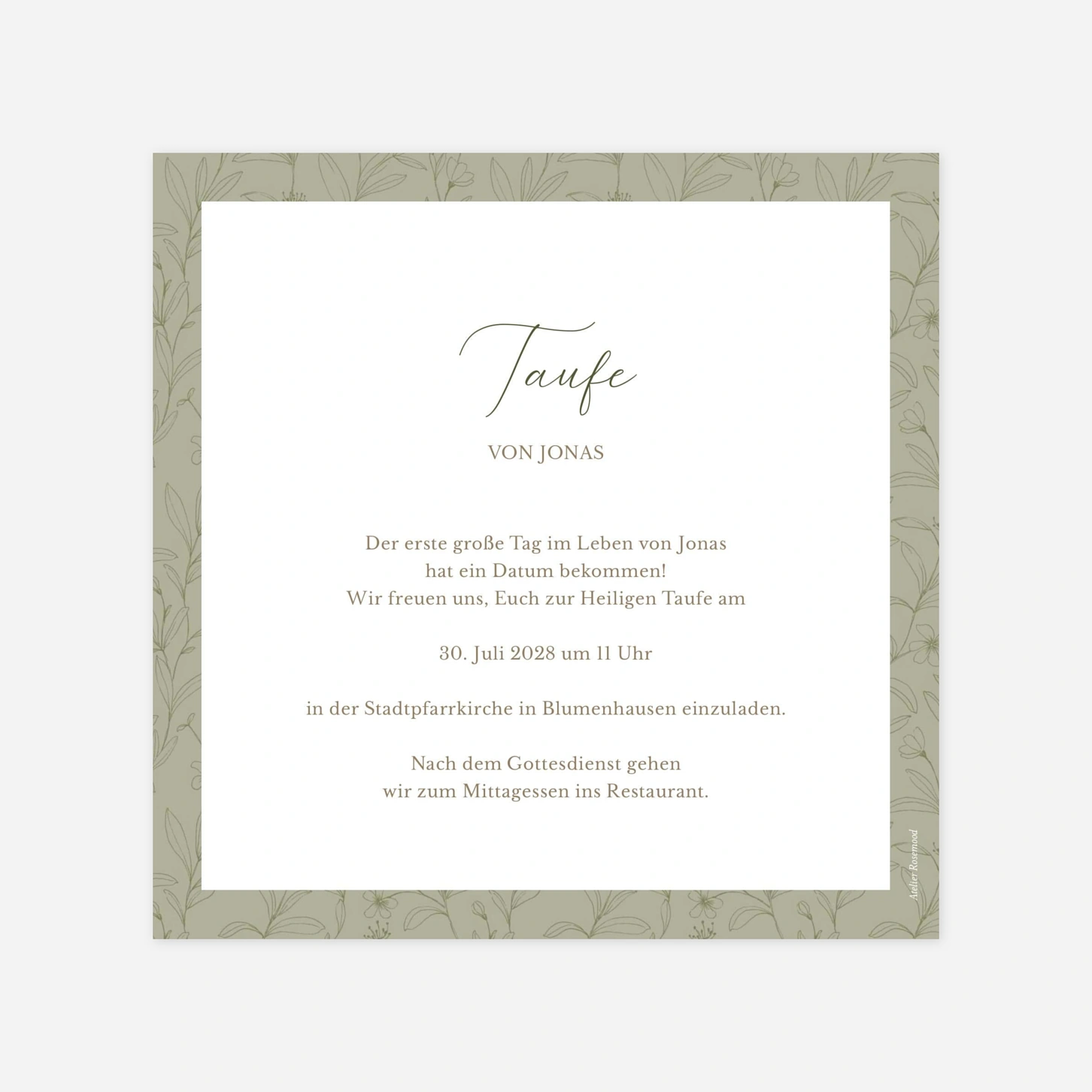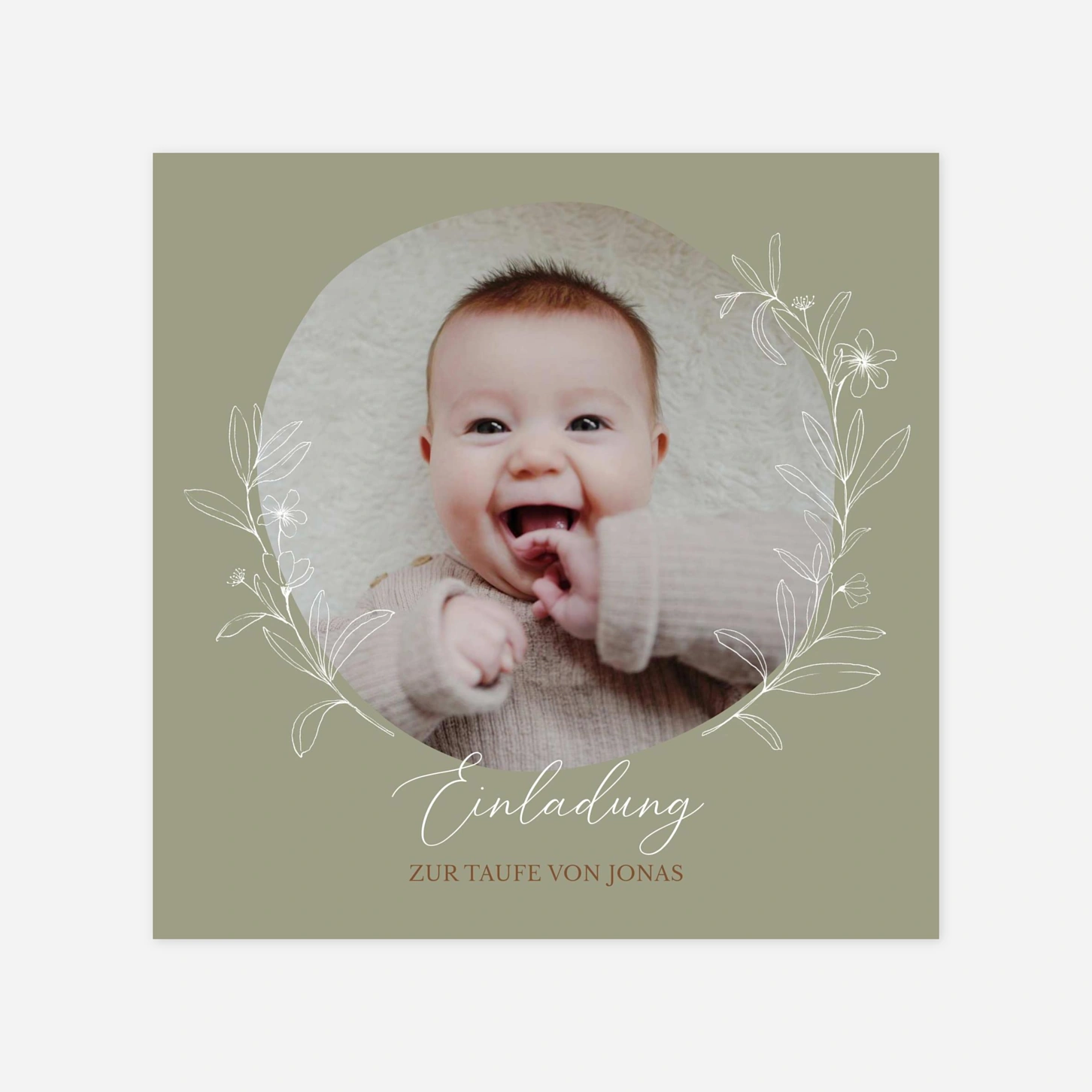 Die Taufeinladung „Taufsegen“ begleitet diesen besonderen Moment mit einer ruhigen, liebevollen Gestaltung und viel Raum für Ihr persönliches Foto. Zarte Illustrationen und eine harmonische Typografie verleihen der Einladung zur Taufe eine zeitlose Ausstrahlung, die Familie und Freunde berührt. Diese Taufeinladung lässt sich individuell anpassen – ideal, um Ihre Taufeinladung zu gestalten und stilvoll zu versenden. Wie alle unsere Karten wurde das Design in unserem Atelier entworfen und in unseren eigenen Produktionsstätten in Deutschland und Frankreich mit größter Sorgfalt gedruckt. Lassen Sie Ihre Einladung zur Taufe jetzt ganz einfach drucken lassen und online personalisieren.
