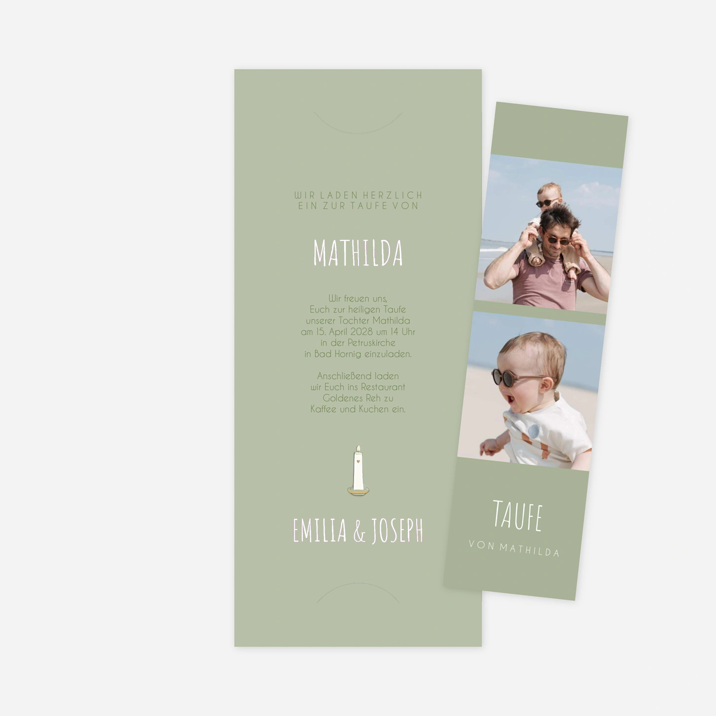 Die Taufeinladung „Zauberhafte Taufe“ strahlt natürliche Leichtigkeit und liebevolle Schlichtheit aus – perfekt, um Familie und Freunde zu einem besonderen Tag einzuladen. Das Design mit Foto und feinen Symbolen rund um die Taufe verbindet Modernität mit zarter Symbolik. Personalisieren Sie Ihre Einladung mit den wichtigsten Details und einem schönen Foto Ihres Kindes. Gedruckt wird in unseren eigenen Werkstätten in Deutschland und Frankreich auf hochwertigem Papier – für einen besonders edlen Eindruck.