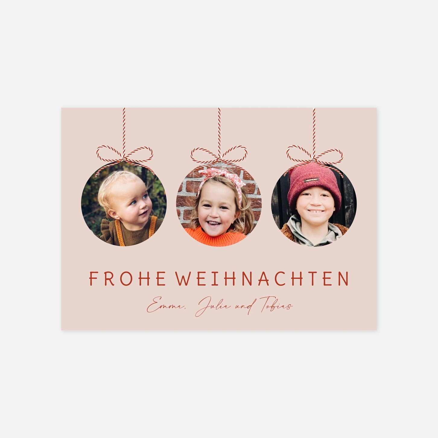 Die fröhliche Weihnachtskarte "Baumfunkeln" rückt Ihre Liebsten auf spielerische Weise in den Mittelpunkt des Festes. In drei illustrierten Christbaumkugeln kommen Ihre schönsten Familienfotos besonders charmant zur Geltung und verbreiten sofort eine herzliche Weihnachtsstimmung. Diese liebevoll gestaltete Karte wird in unseren eigenen Ateliers in Deutschland und Frankreich für Sie gefertigt, um eine erstklassige Druckqualität zu garantieren. Lassen Sie Ihre persönliche Weihnachtskarte drucken und senden Sie ein Lächeln an Freunde und Verwandte. Gestalten Sie Ihr Set jetzt ganz einfach online und verleihen Sie Ihren Festtagsgrüßen eine individuelle Note.