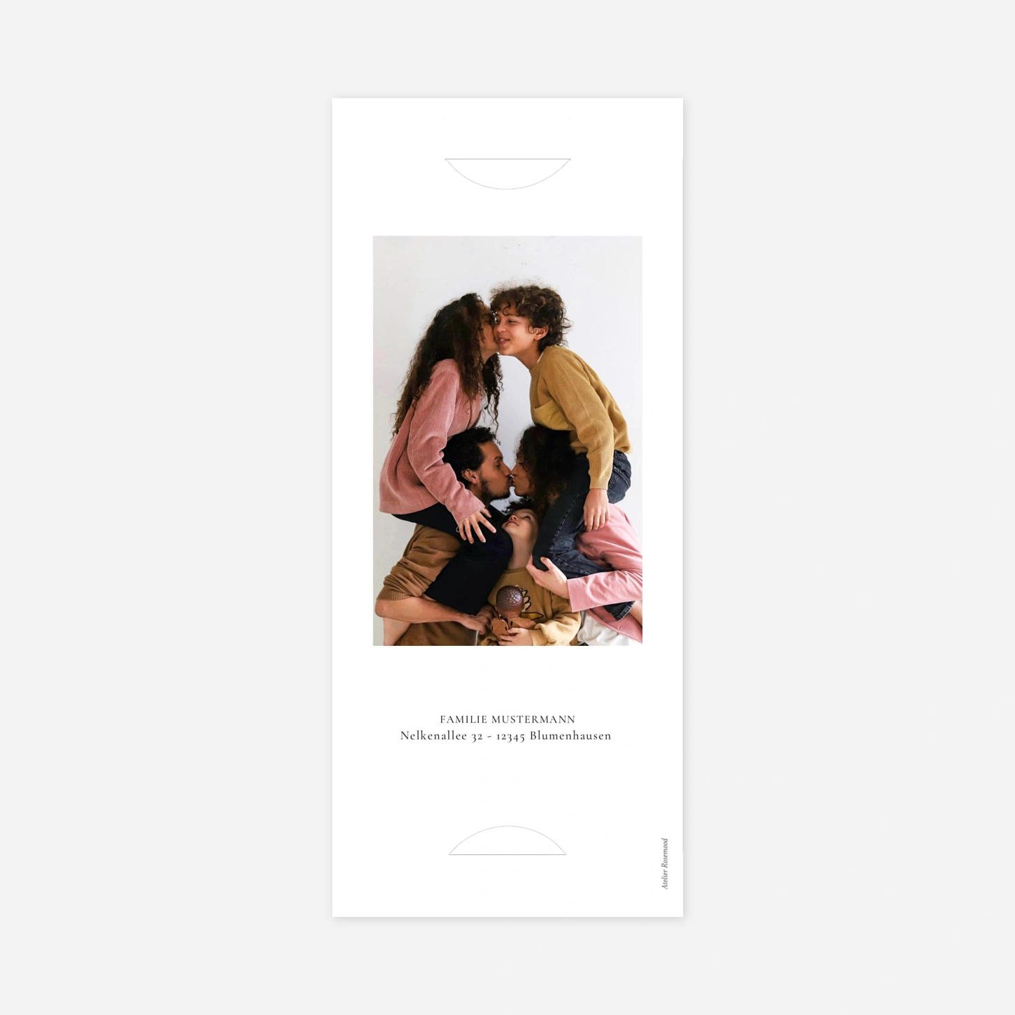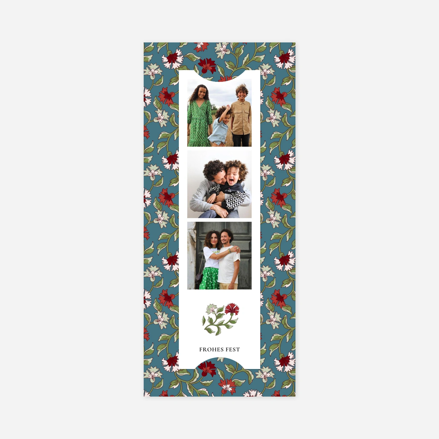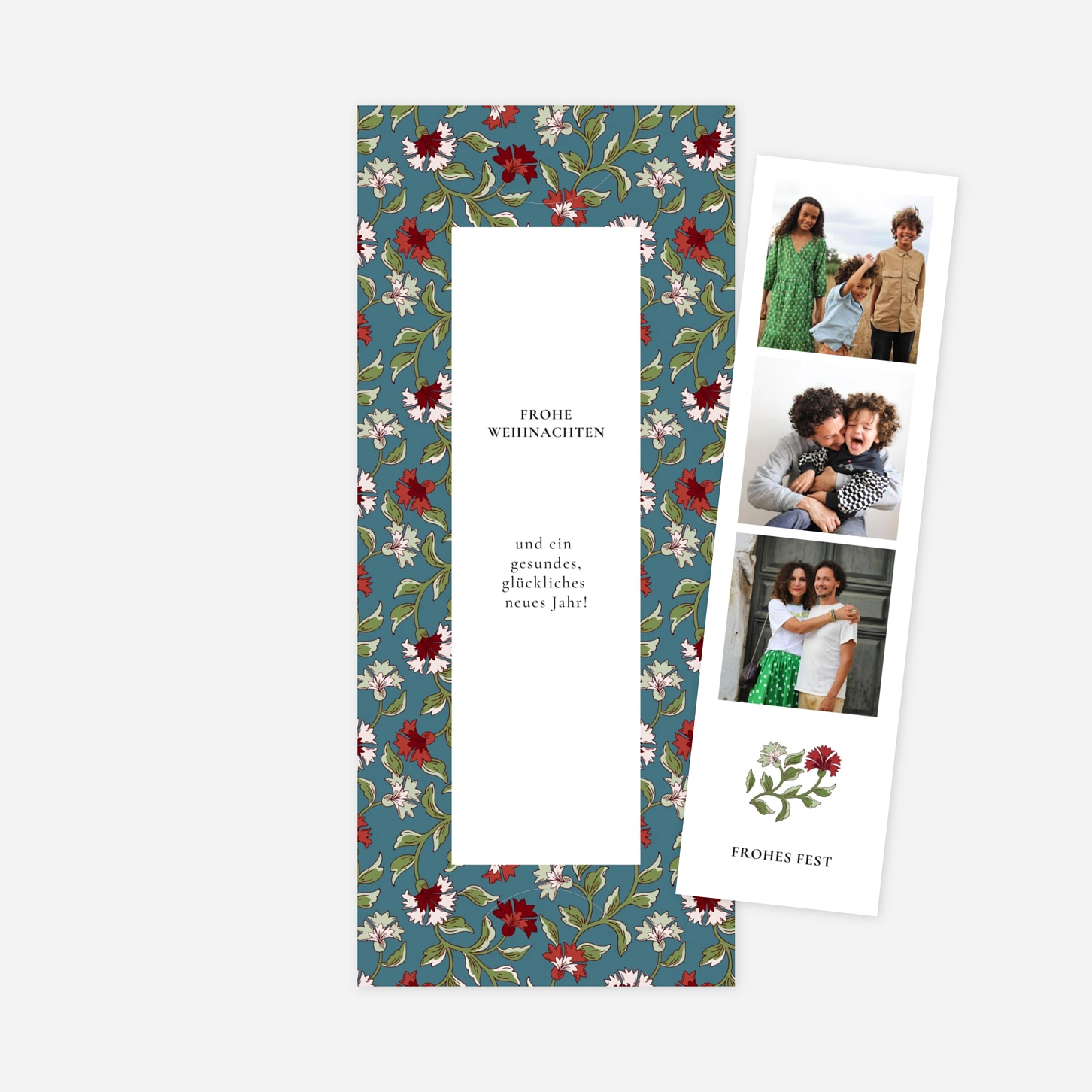 Die Weihnachtskarte Blütezeit ist ein besonders originelles Modell und stammt aus der Feder unserer talentierten Designerin Margaux Fugier. Unzählige zweifarbige Blüten ranken sich um Ihr schönstes Foto, das wie in einem klassischen Bilderrahmen präsentiert wird. Die Rückseite dieser beidseitigen Karte ziert ein weiteres Foto sowie eine Blüte als Motivdetail. Die weihnachtlichen Grußworte können Sie in unserem Online-Editor individuell personalisieren. Wie wäre es mit einem schönen Spruch? Stöbern Sie gerne durch unsere Auswahl an Textideen für Weihnachtskarten und lassen Sie sich inspirieren! Diese Karte ist in drei Farbvarianten erhältlich: Petrolblau, Grün und Beige. Welche ist Ihr Favorit? Außerdem können Sie sich für klassische oder abgerundete Ecken entscheiden. Bei Fragen zu unseren Weihnachtskarten Blütezeit sind unsere hilfsbereiten Kundenberater gerne für Sie da.