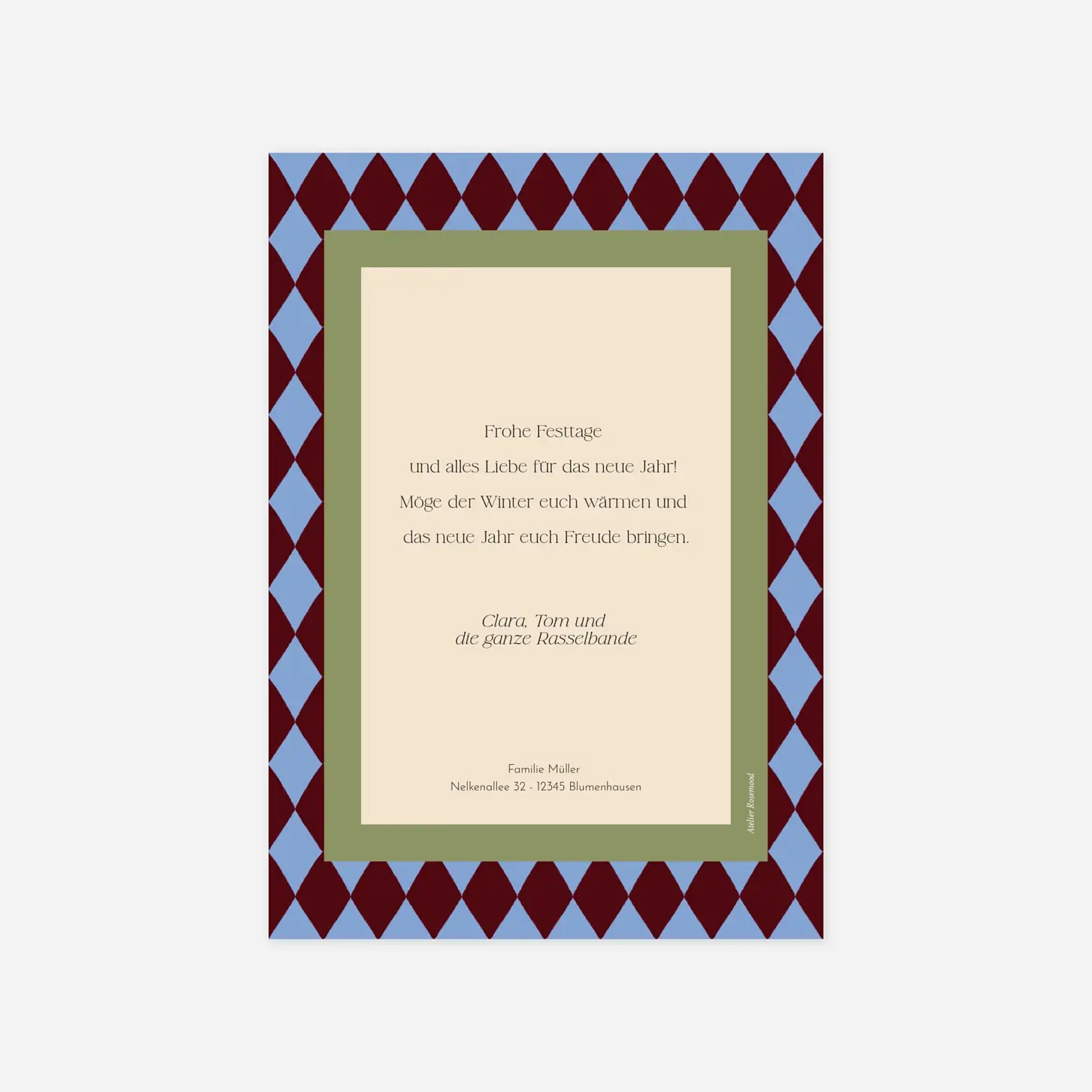 Die Weihnachtskarte „Bunte Feiertage“ bringt mit ihren fröhlichen Farben und liebevollen Illustrationen festliche Stimmung in jedes Zuhause. Ideal für alle, die ihren Liebsten ein farbenfrohes und herzliches Weihnachtsfest wünschen.